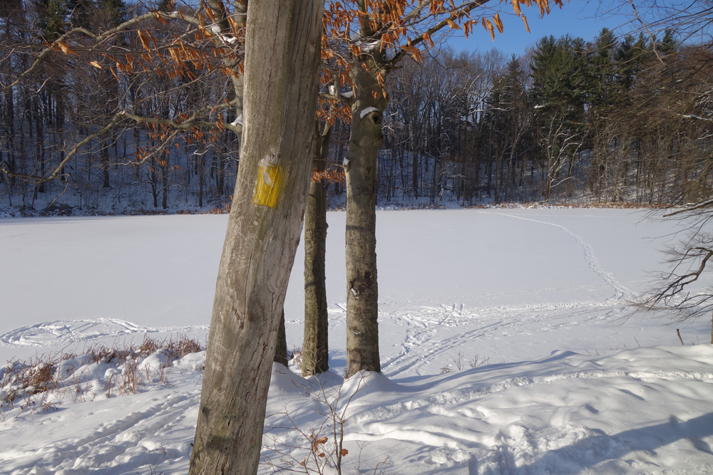 We stood on this point on the edge of Eastman Lake trying to decide if the ice was frozen solid enough for us to ski across. We discussed what it would be like to fall in the water in 15 degree weather and then decided to stay on the path that runs along the shore.