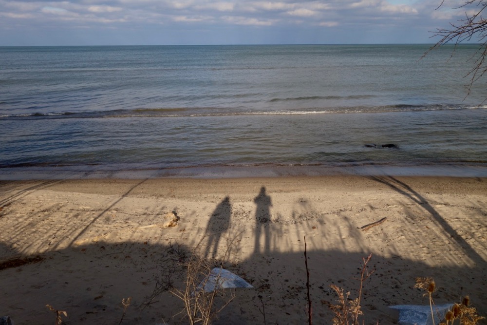As you can see from the evidence in this photo, the sun, even in the early afternoon, is way down south. Because the temperature was near freezing we felt safe enough to take our woods path up to the lake. The ticks are supposed to be inactive at 40 degrees. We had not been through the Commons in months. Someone has cleared the fallen trees and the trail is ready for cross-country skiing. We did a little extra maintenance, removing branches and fallen debris. We got all the way up to the lake without seeing any deer. Maybe the bow hunters put a dent in the population. We saw Steve Greive the other day and he said he had shot four on his property. The lake is still supposed to be a foot above normal but there is plenty of beach there.