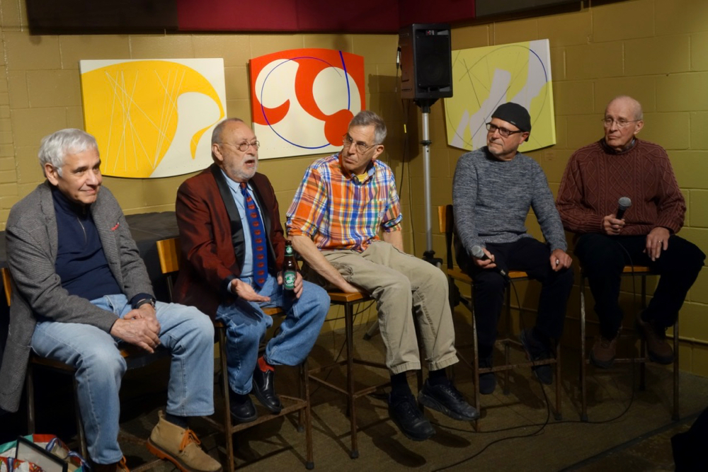 I gather that Pete Monacelli put the Mise En Place art group together, a bunch of artists who meet once a week for lunch. They say they talk about art but Peggi and I met them one week, by chance, and the talk was what I would call free-ranging. We have gotten to know all these guys over the years and it was fun to hear them tell their familiar stories at the artist talk/closing party for their group show at the Little Theatre Café. A key member, Kurt Feuerherm, left before the talk and Bob Conge was recovering from an operation. My favorite part of the talk was when Bill Keyser, on the far right, spoke about how he was interested in found materials. He would finish a piece of furniture after working on it for a few months and come back into his studio to find a leftover piece of wood or odd cut that he found more intriguing than his piece.