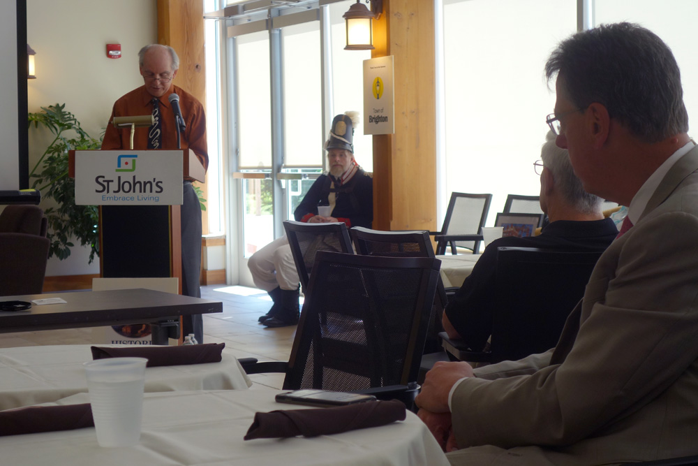 William Keeler, Librarian & Archivist at the Rochester Historical Society, gave the featured presentation at the annual Gideon Cobb Day Celebration in Brighton. His talk, “Rochesterville on the Rise,” started with the Native American trading post near Indian Landing a couple hundred years ago. The British controlled the waters of Lake Ontario before the War of 1812. A reenactor can be seen in the photo above along with John Page and Brighton’s Town Supervisor William W. Moehle.