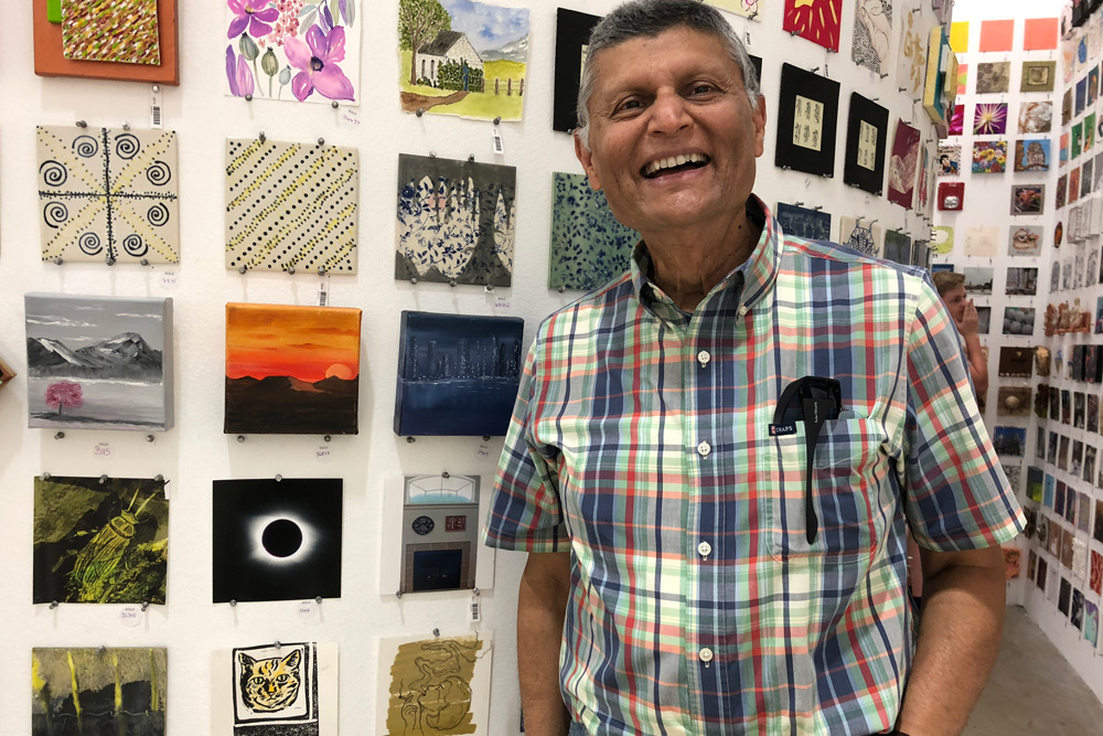 They have finally run out of room over there. Next year Bleu says they will go down to maximum of three per person. I remember when it was ten. I was happy to see that mine had sold. I’ve been using my submissions in an ever more minimal direction. And I was thrilled to find that three small paintings that I liked the most were all still available. That says something about either my taste or everybody else’s. Peggi found one as well. She brought me over to look at it and as luck would have it the artist was standing nearby. Kishan Pandya told us they travelled to South Carolina to see the recent eclipse and he took this amazing photo. It reminded me of a Sol Lewitt.