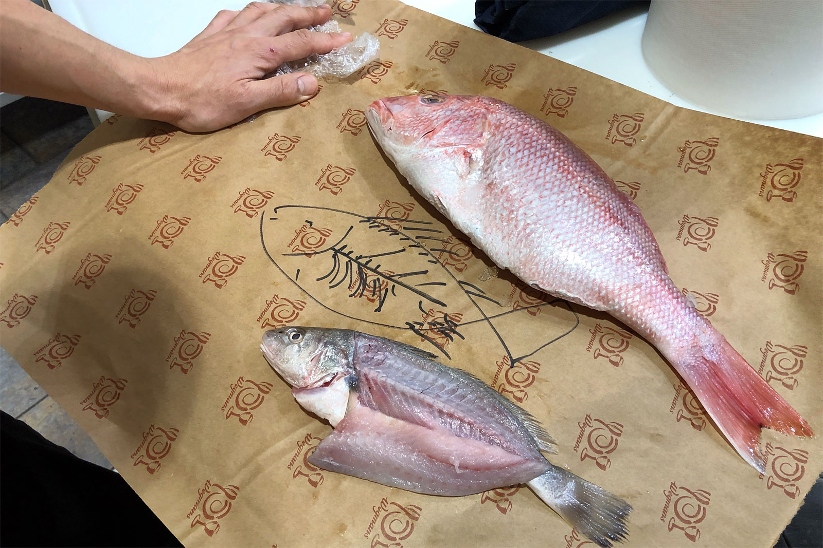 The fish guy told us he would cook it exactly as we did and then eat it with chopsticks because he knew how to pick around the bones. He drew the fish (above) in a few seconds. He even made the fish smile. He illustrated where to look for the various bones. He grabbed another fish, one that he had just filleted, and suggested we cut the fish open before we bake it, remove the bones, put it back to gather like a whole fish and then bake it.