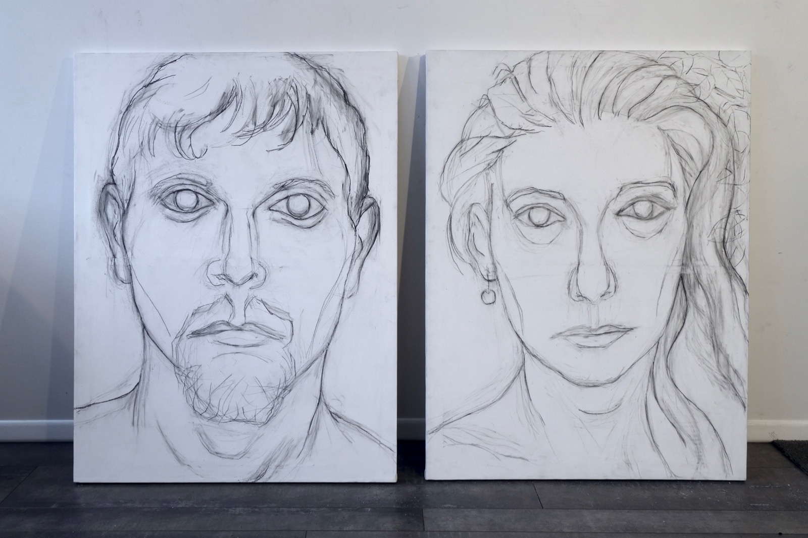 I watched these two in person. She was pacing with her phone and he was talking to someone else on his device, using the free library wifi. She was strung out. He looked like he could give a shit. Next thing you know their mugshots were in the news. Today I surrounded them with garden foliage. I’m doing them as Adam and Eve and hope to begin painting tomorrow.