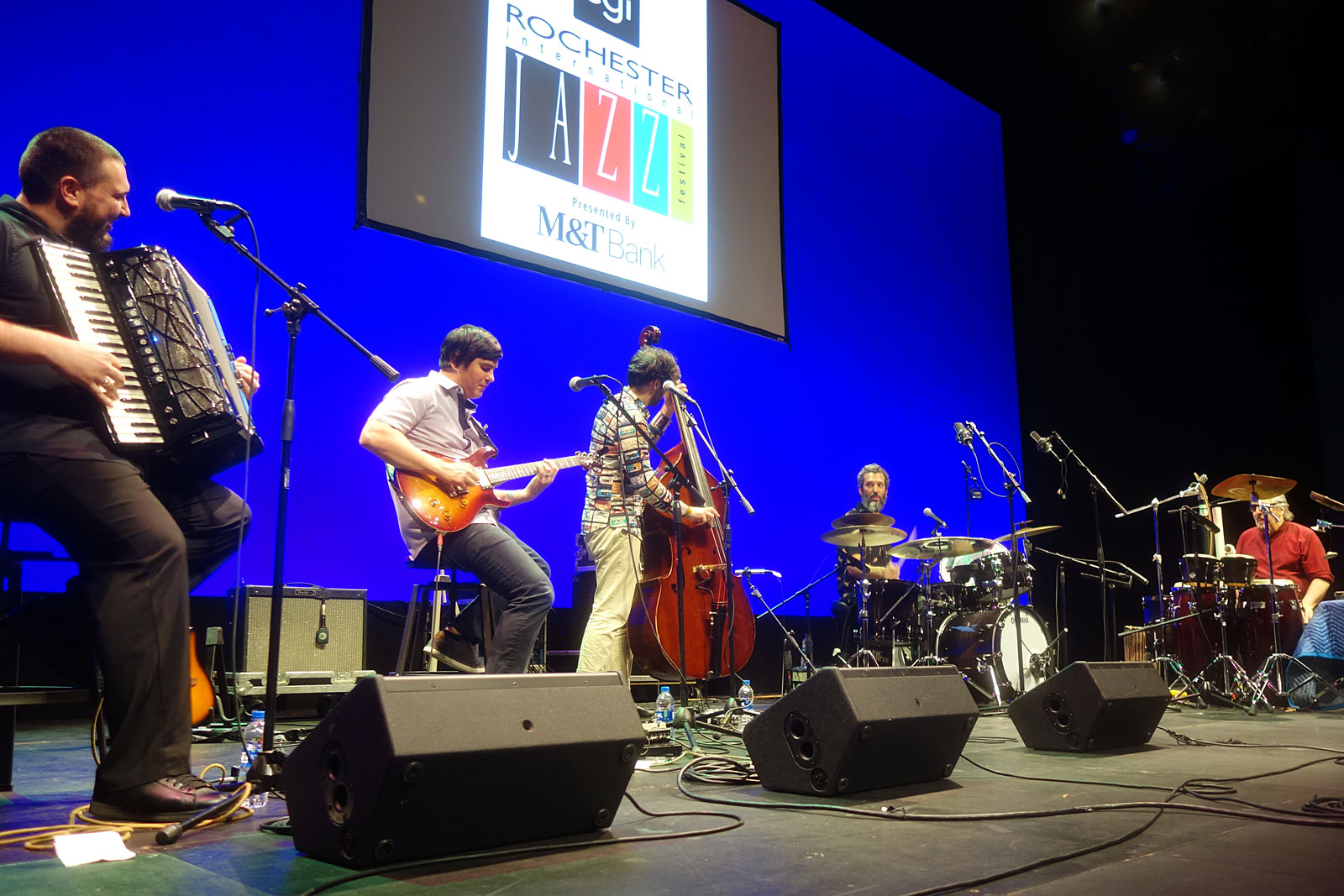 Brazilian percussionist, Cyro Baptista, played with Laurie Anderson, Gato Barbieri, David Byrne, Dr. John, Brian Eno, Milton Nascimento, Carlos Santana and Caetano Veloso. He has been here a few times, always with a completely different band, and he is always irresistibly entertaining. Joyous Brazilian rhythms are the foundation of his music but his ensembles, exceptional team players, work with a full palette of world music. They opened the set we saw with a Don Cherry composition.