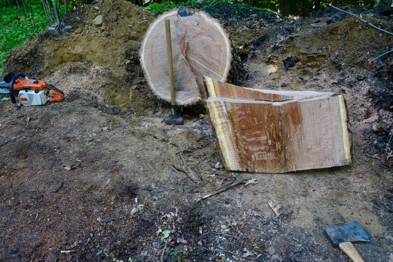 I positioned our sledge hammer in from of this stump so you could get some idea of the scale. This oak tree fell on Peggi’s birthday. It took down the power lines and trapped our whole neighborhood. The power company cleaned it up but there was three log lengths of good firewood still on the base so Peggi and I went down there with our chainsaw, the one we bought from John Gilmore when he retired. It has a sixteen inch blade and it wasn’t quite long enough to cut halfway through. We wrestled with this one for a few hours.