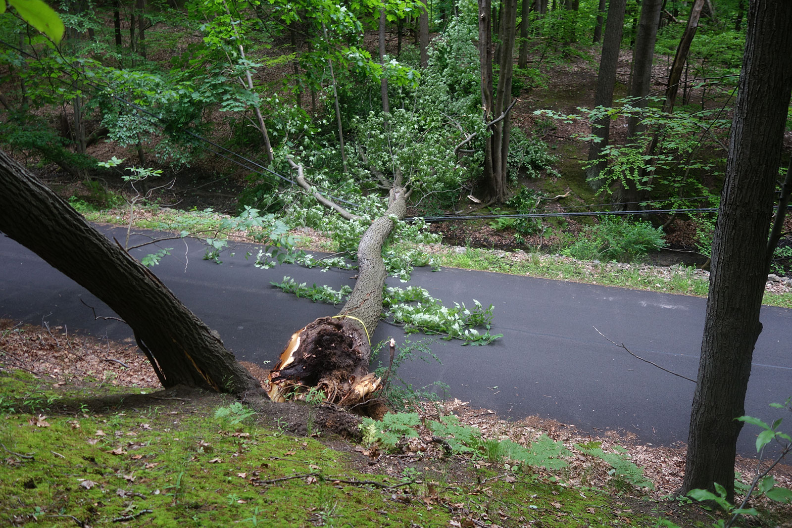 Today we got by the dog without a hitch and we ran into a young woman who told us she was also terrorized by the dog. She showed us the scar on her leg from a dog that had come after her while she was walking a few years back. While we were talking a large branch fell across the road. It hit the power lines and a crackling bolt of electricity shot down the line that ran just above our heads. We continued on up to Wegmans and by the time we returned the power company was restoring our electricity.