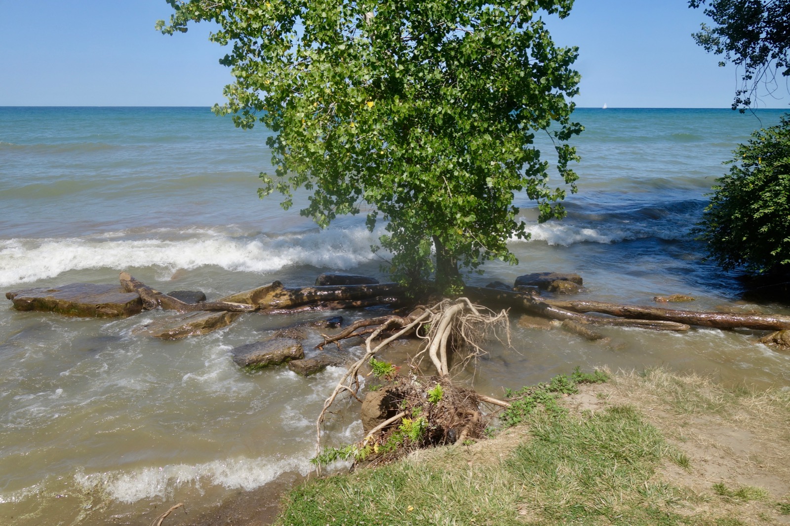 The lake level is a little higher. The beach is a little smaller. This beech tree is hanging on by a thread.