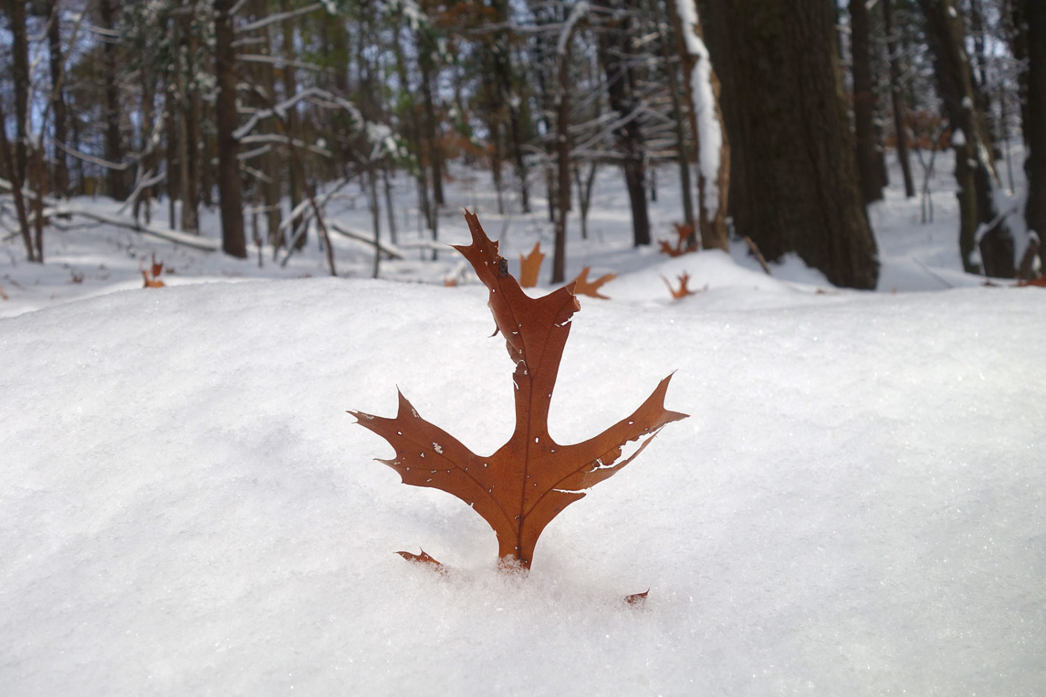 Does this leaf look happy? As light as leaves are they are weighted more heavily on the stem end. And when the snow comes before the leaves have all fallen we get this delightful show.