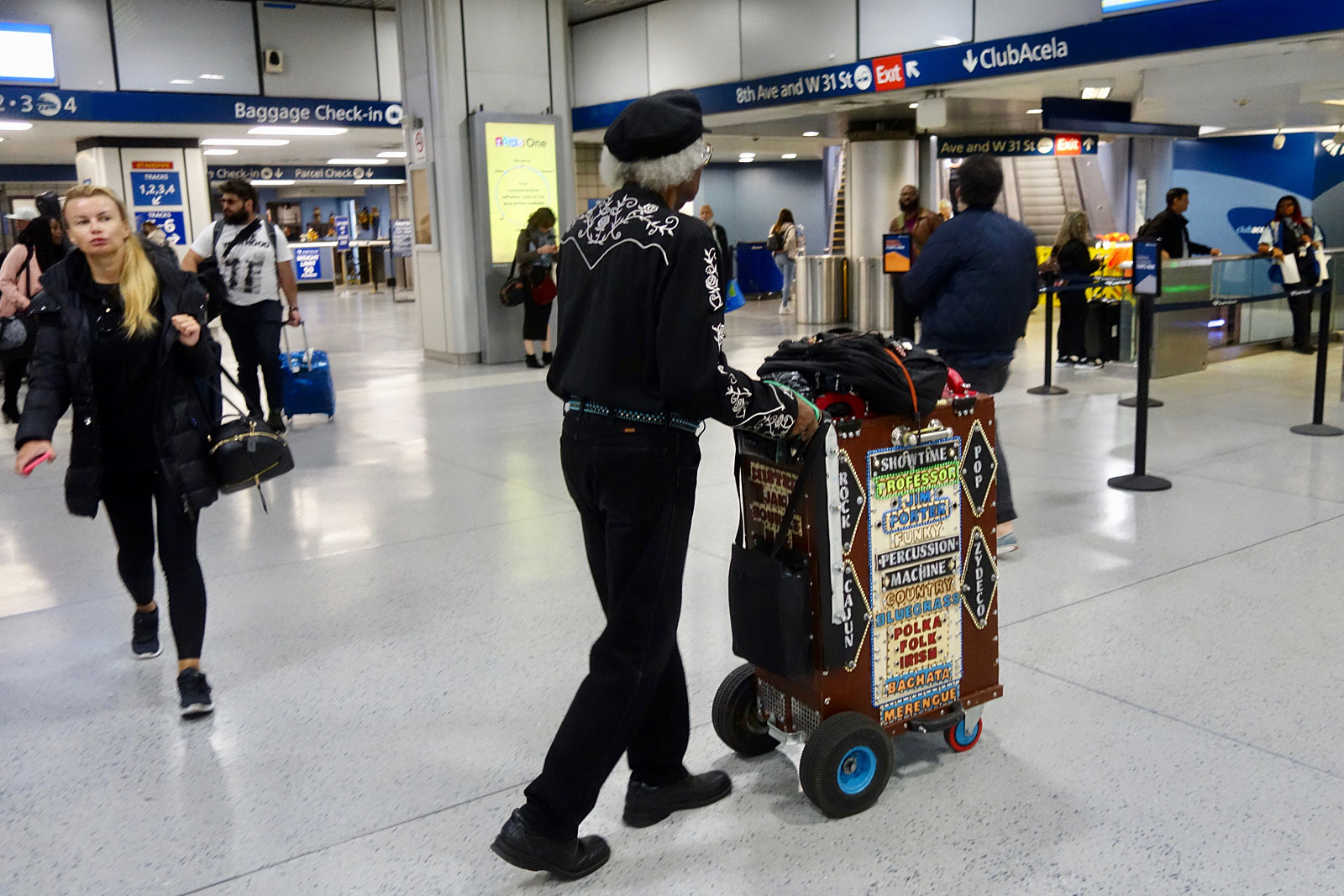 We were kinda late for our train or I would have stopped to talk to this guy in Penn Station. He looks like a one man band with his stage gear on and his equipment case advertising a Funky Percussion Machine, Country, Irish, Polka, Zydeco and something called Bachata. I wanted to go where he was going but our train was boarding in the other direction.