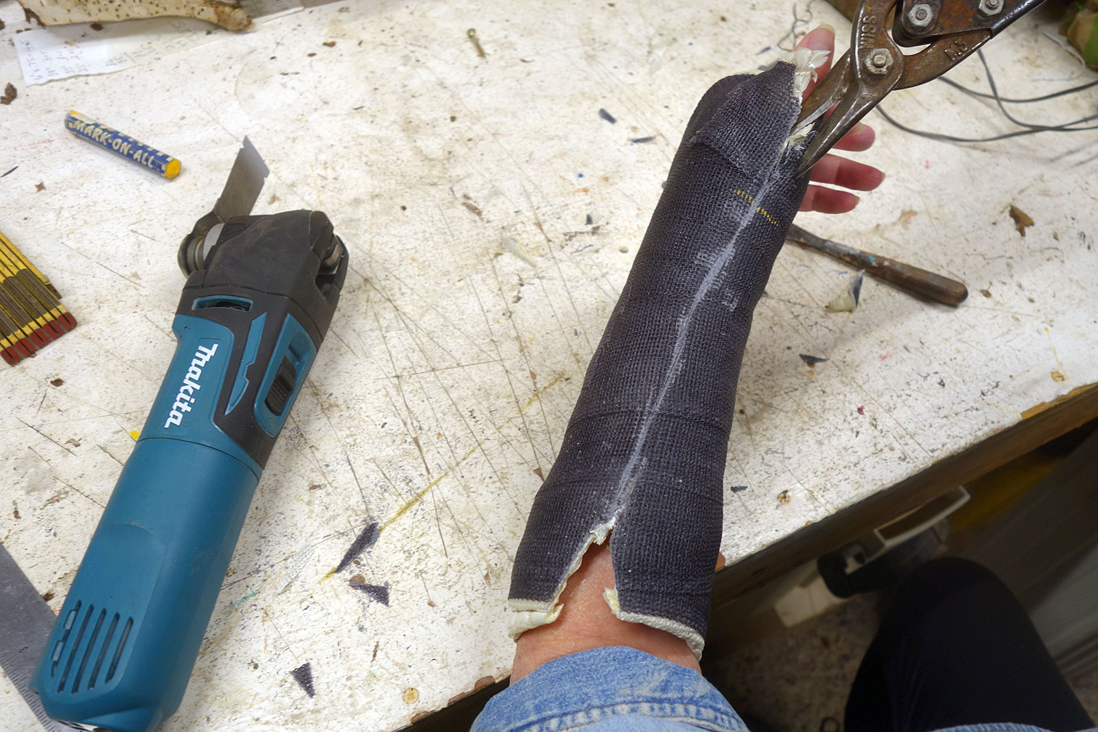 This one guy took his son’s cast off while they were camping somewhere in a trailer. He was wearing a Superman t-shirt and it looked like his sone was terrified of him. The video had thousands of views but he had turned comments off and was selling real estate ads in the about section. Doctors would use a Dremel and vibrate a score line down both sides. I borrowed this Makita oscillator from my neighbor and tried to score the cast with it but the wire cutters did the job.