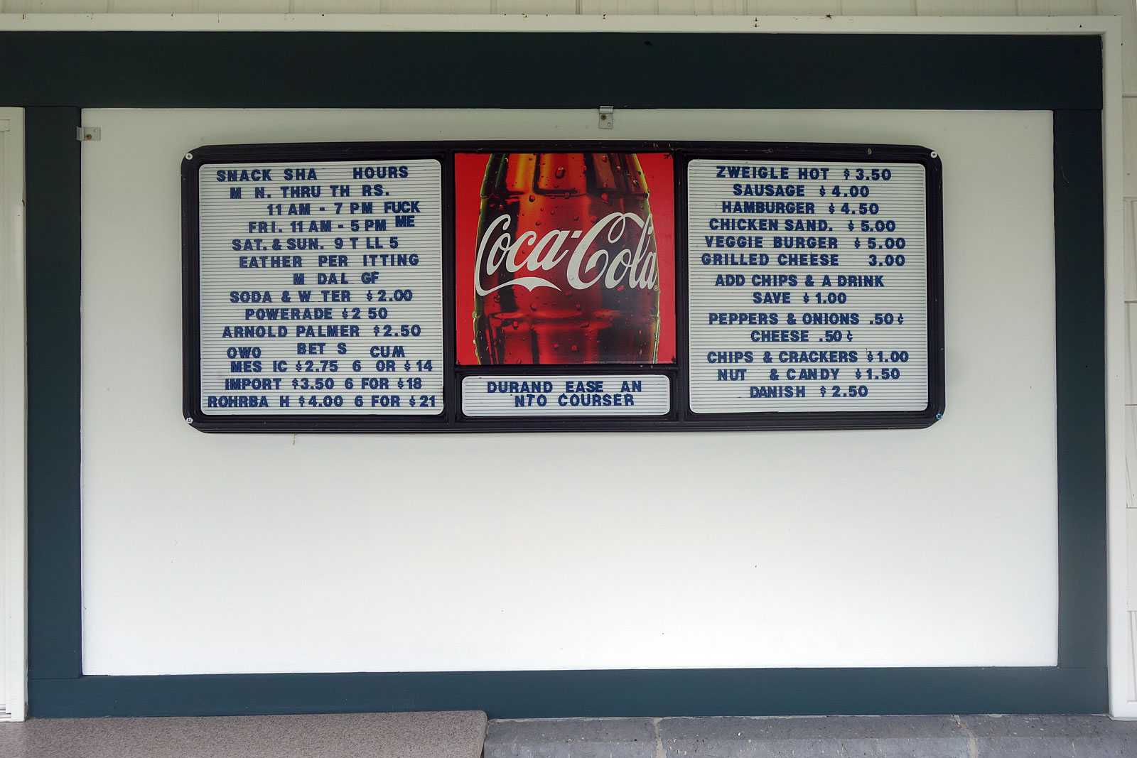 We cut across the golf course this morning on our way to the lake, taking a chance that they hadn’t opened for the season. I’m still a bit gun shy after someone yelled “Fore” and I turned in the the direction of the voice only to get beaned in the forehead. We thought we saw a sign on the Snack Shack door so we walked up close and saw that someone had rearranged the letters on the menu.
