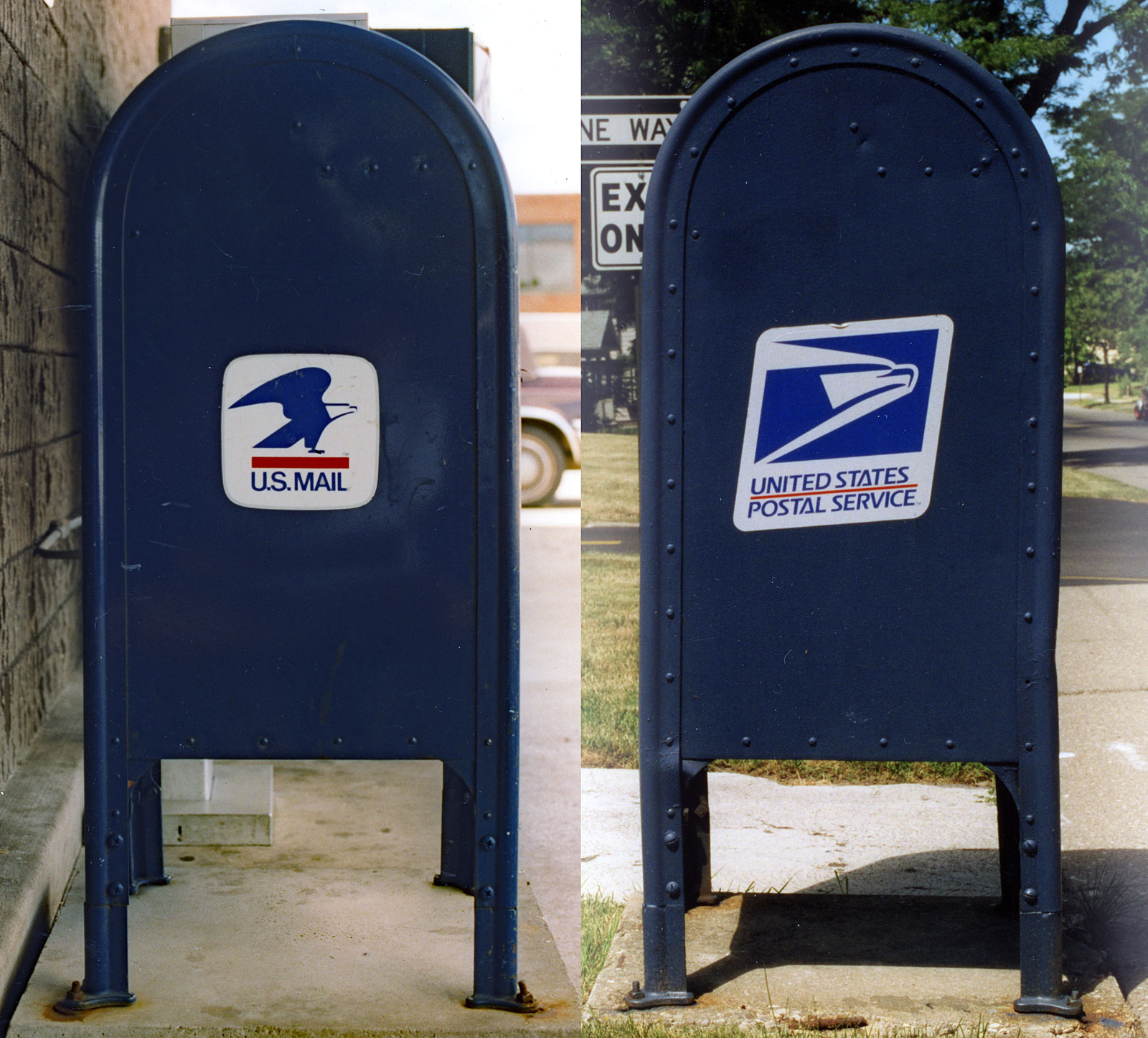 I’m still steaming about the Post Office”s move in 1999 to replace the distinctive logo that fit perfectly on the outdoor boxes with some sort of italicized, speedy like Fed Ex, abomination. The new logo makes the fifties’ styled boxes look like they’re falling over. The old logss are still there under the bigger parallelograms. Maybe we can steam them off.
