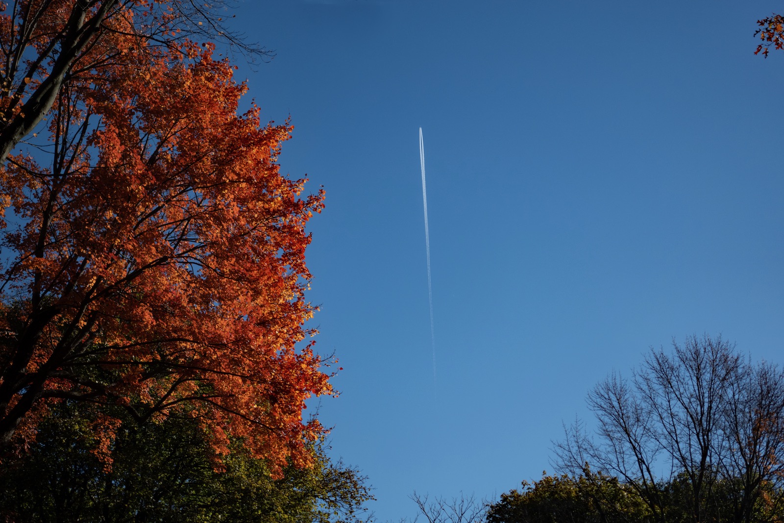 Today was a good day for looking up. With temperatures in the seventies and the sky a pure blue it was easy to forget about politics for a few brief minutes. As I took this photo a woman on Wisner came out of her house to ask if she could help me. I always say “no” in these situations but Peggi decided to defuse the situation by explaining that I was not taking a photo of her house and she pointed to this plane.