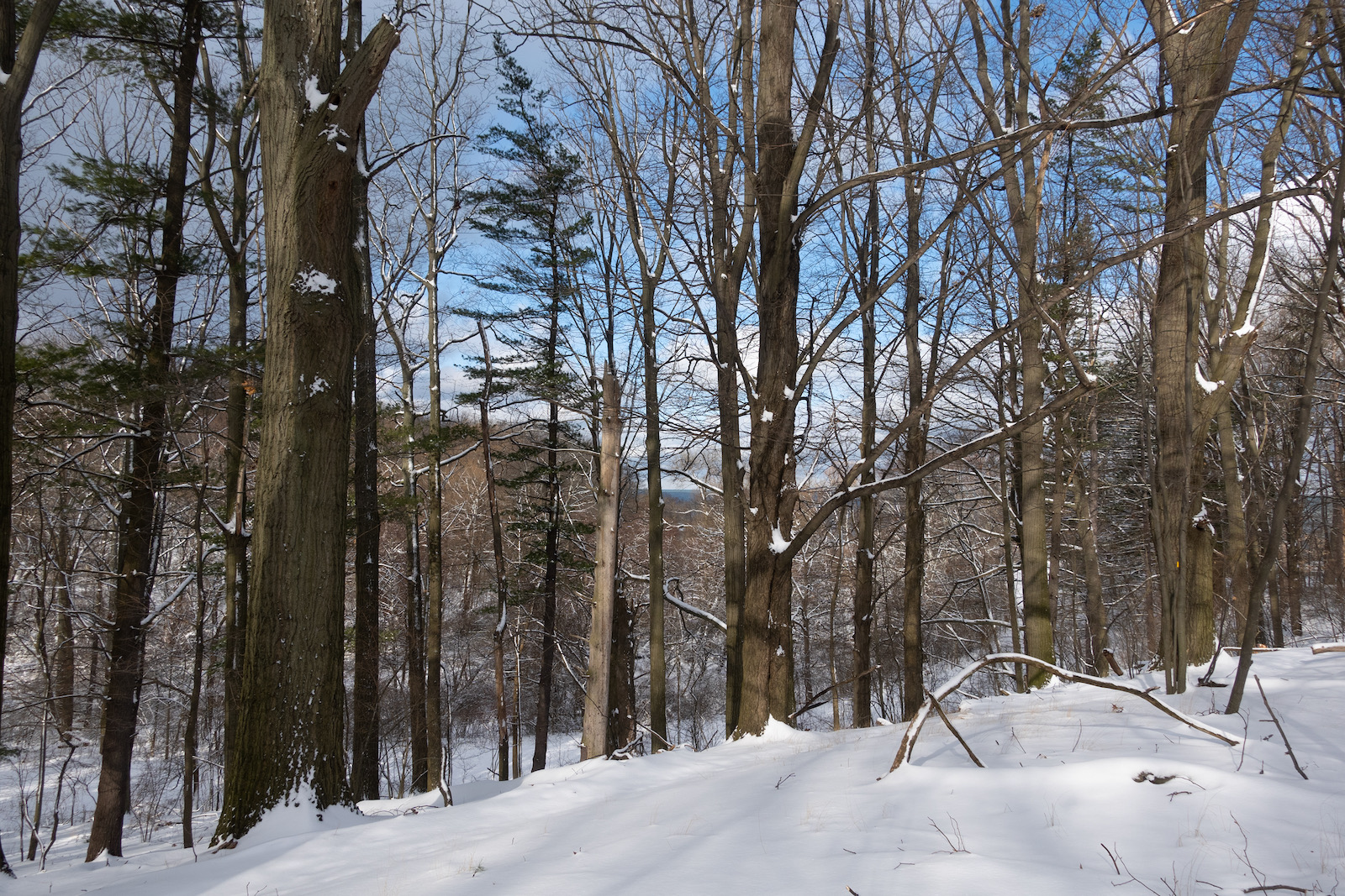 I shoveled the driveway and Peggi cleaned off the fire-pit seating and then we strapped on our skis. Avoiding the horseshoe stakes the horseshoe stakes we go downhill to Jared’s and around his pond, then across the street and into the woods. We zig zag down the big hill, skiing into the bank from side to side to slow our descent. Ten years ago we would take that thing head-on.