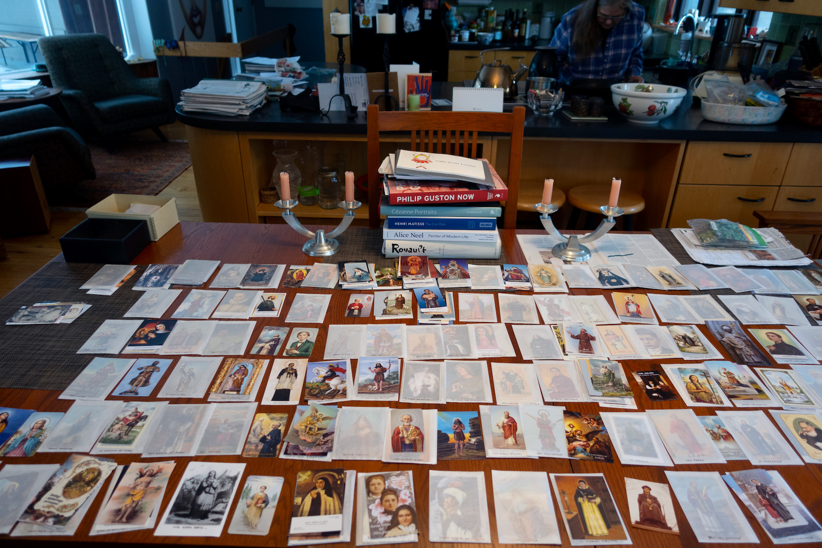I hung on to some cards from childhood. They were given to us on special occasions and stuffed in our missiles as bookmarks. I bought some at Trant’s Catholic Supply Store on Clinton Avenue South. Most of them were printed in Italy. Every town in Spain has a patron saint and holy cards are pinned to the wall behind the counter in coffee shops and bars. You can still find them in the vestibule of churches, old women sell them out front but everything is changing. Gift shops sell cards on rotating spindles. They’re sealed in plastic, often with a medal attached and they’re expensive. I like the paper cards. You used to be able to buy four or five of them for a Euro. The very best ones were made by C. Mariana in Barcelona.