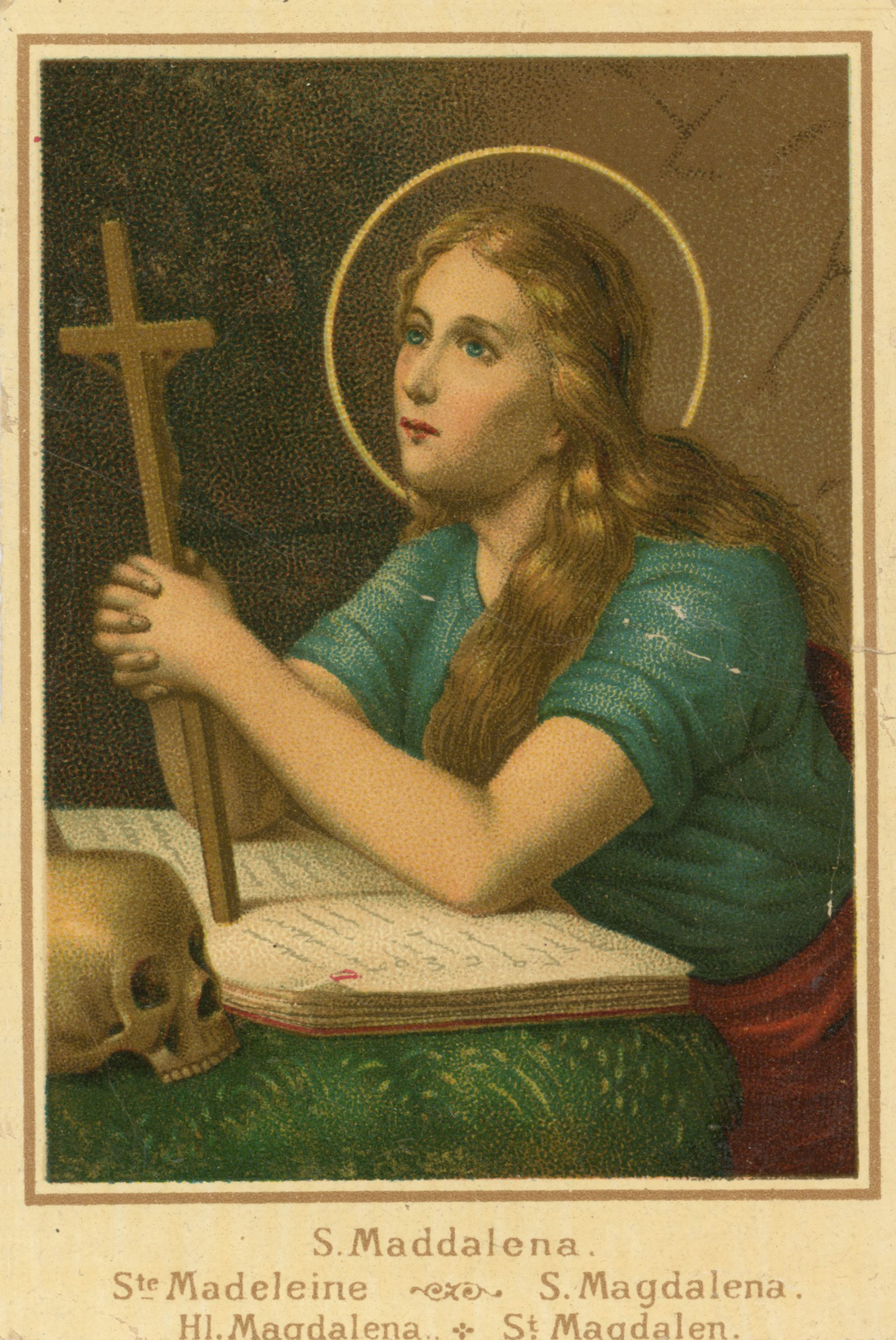 I found a Mary Magdalene card in Madrid on our last trip, my first one, and I got intrigued with her legend. A prostitute, possessed by seven demons, rumored to have been Jesus’s wife, she was there at the the crucifixion and then the resurrection. She is typically pictured with a skull. I did search on eBay and found an “antigua estampa religiosa” listing for Mary Magdalene for a couple Euros. I went for it and it arrived today from Granada in an envelope with two beautiful stamps.