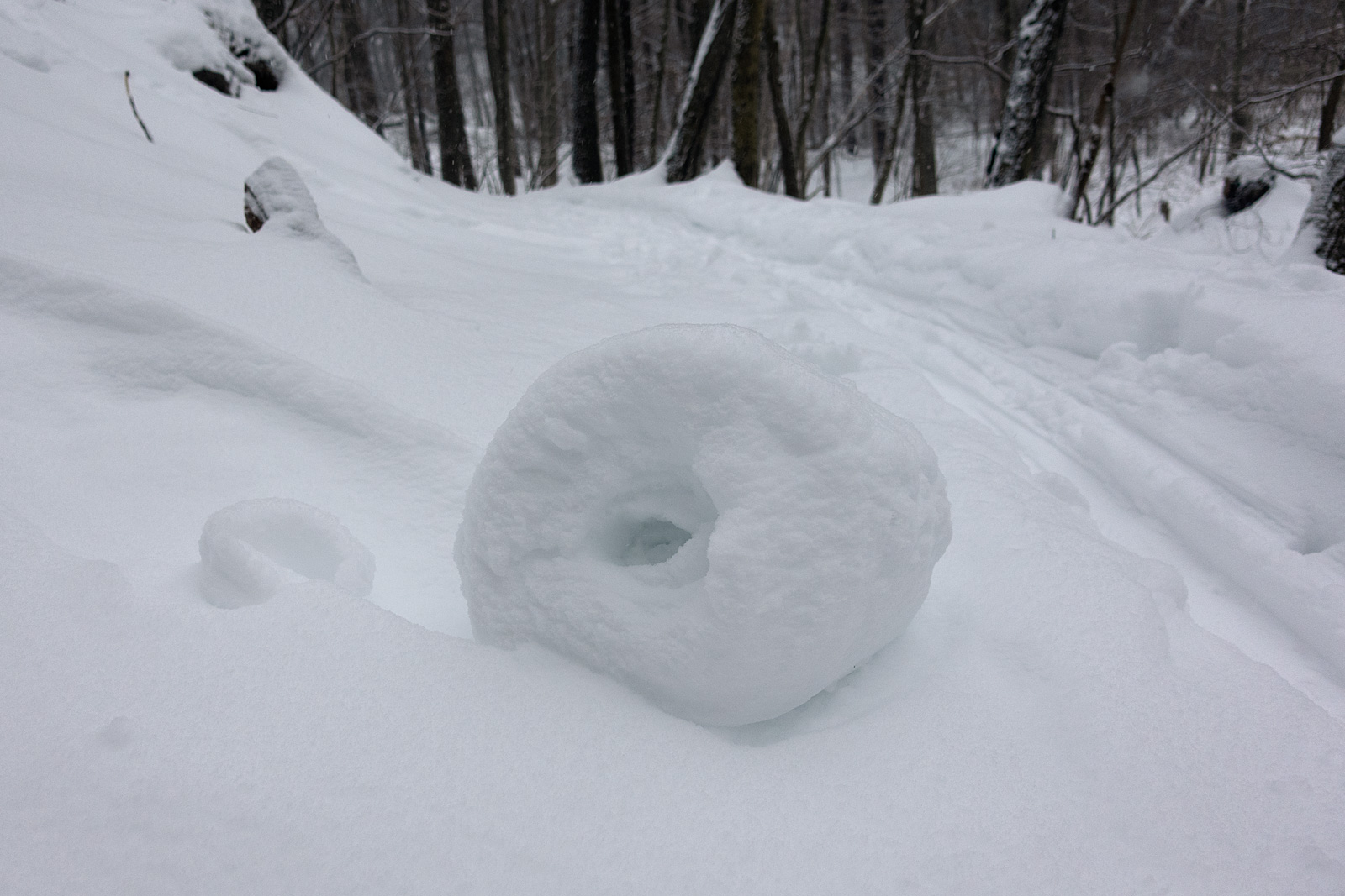 This morning we found this big snow roll at the bottom of a hill near our ski path.