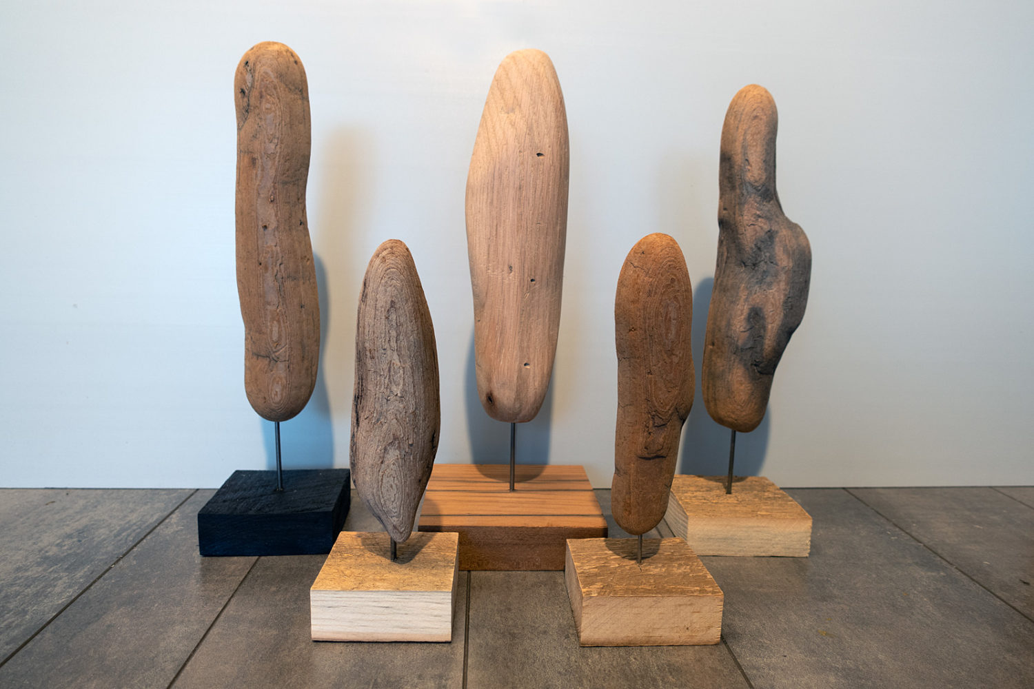 The fifth one, shown in the middle above, is not driftwood. I carved it out of a piece of oak firewood. I spent most of a day in the garage with a chisel and hammer trying to create something as organic as a piece of found driftwood. It’s not easy. I found a piece of wood for the base of that one that I am happy with as is. I will report back on this project.
