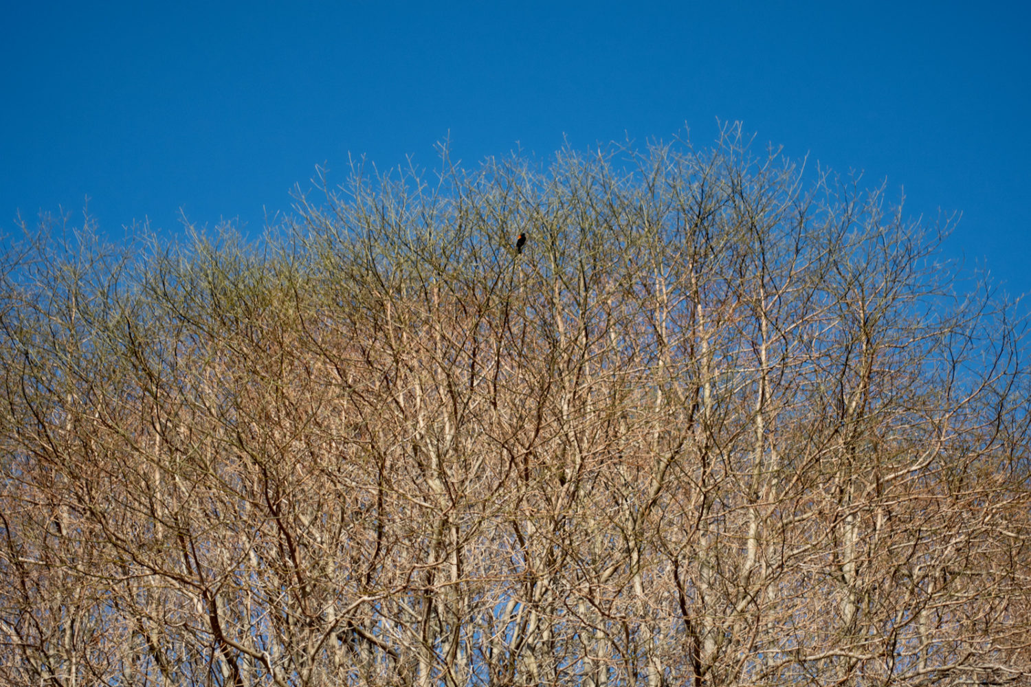 The tops of these trees are turning green. It seems like a miracle. And the call of the red winged blackbird alerted me to this observation.