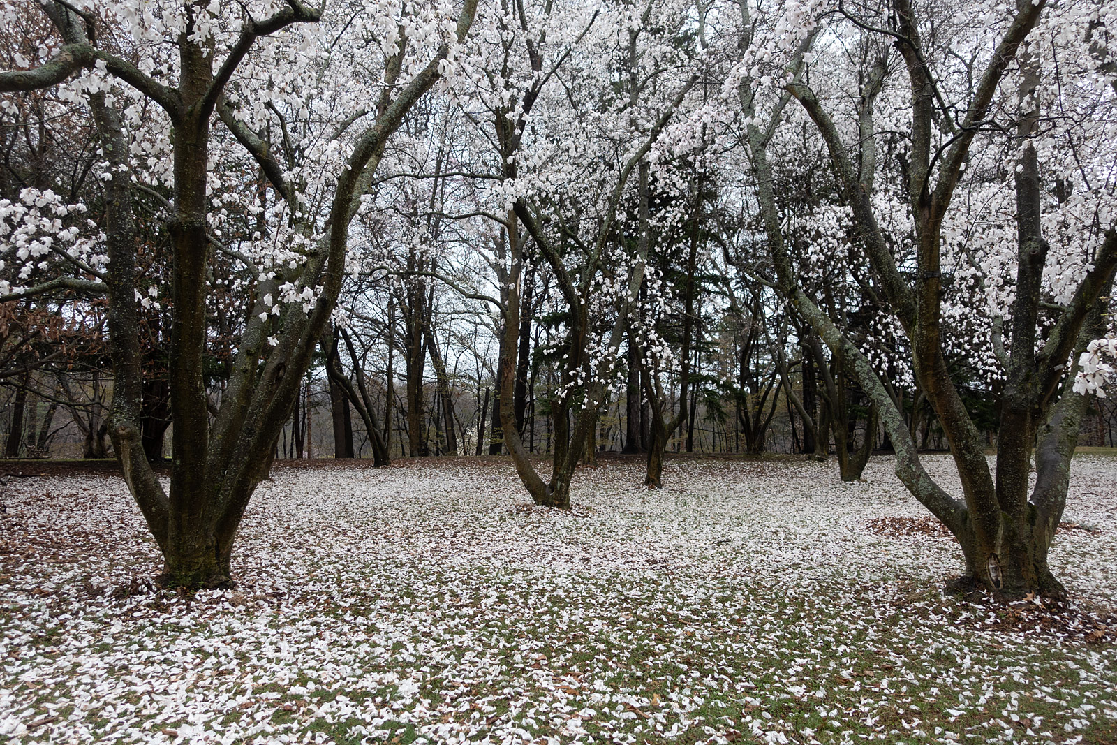 It doesn’t keep us in either. With good rain gear we never miss our daily walk. If we had stayed in today we would have missed this display up on Zoo Road. The snowy Magnolias were in full bloom yesterday and their petals cover the ground today.