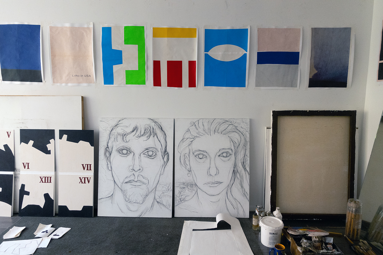 I’m itching to get back my Adam & Eve paintings. They’re based on a couple from Fairhaven that I had the opportunity to observe a few years back. The drawings need massaging before I begin painting. That gallon of gesso in lower right hand corner will take care of the adjustments. Before I dive though in I want to photograph the twenty collages shown drying on the walls. I popped this photo in a second but properly photographing the twenty, individually with the white in each looking white and the colors when used on multiple pieces looking looking the same, is not so easy. I spent the whole weekend on this, longer than it took to do the collages.
