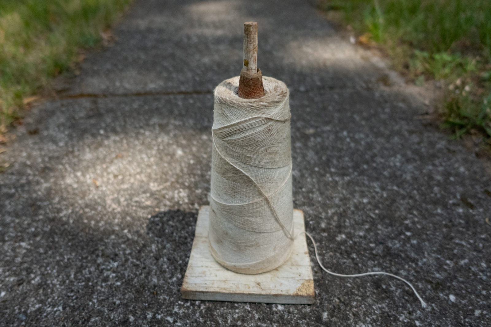We took it down to the garden this morning in order to tie our tomato plants up again. They are all about three feet tall. We started our walk at the garden and continued on from there so I carried the string the whole way, stopping to take this portrait on a sidewalk. Peggi said she hopes we last as long as the string.
