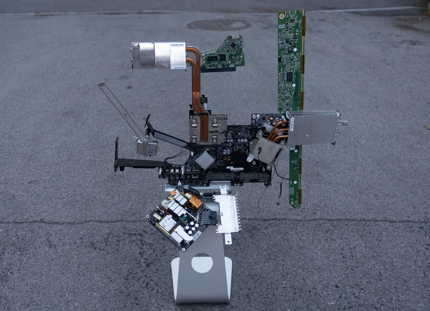 “Miles Runs the Voodoo Down” came on and Pete went through his files to show me a photo of a painting he made in 1972 with the same name. And then he said, “Come over to my studio. I want to show you this sculpture I made.” We walked across the street and Pete opened the garage door. On his bench was his 20011 iMac, rearranged.