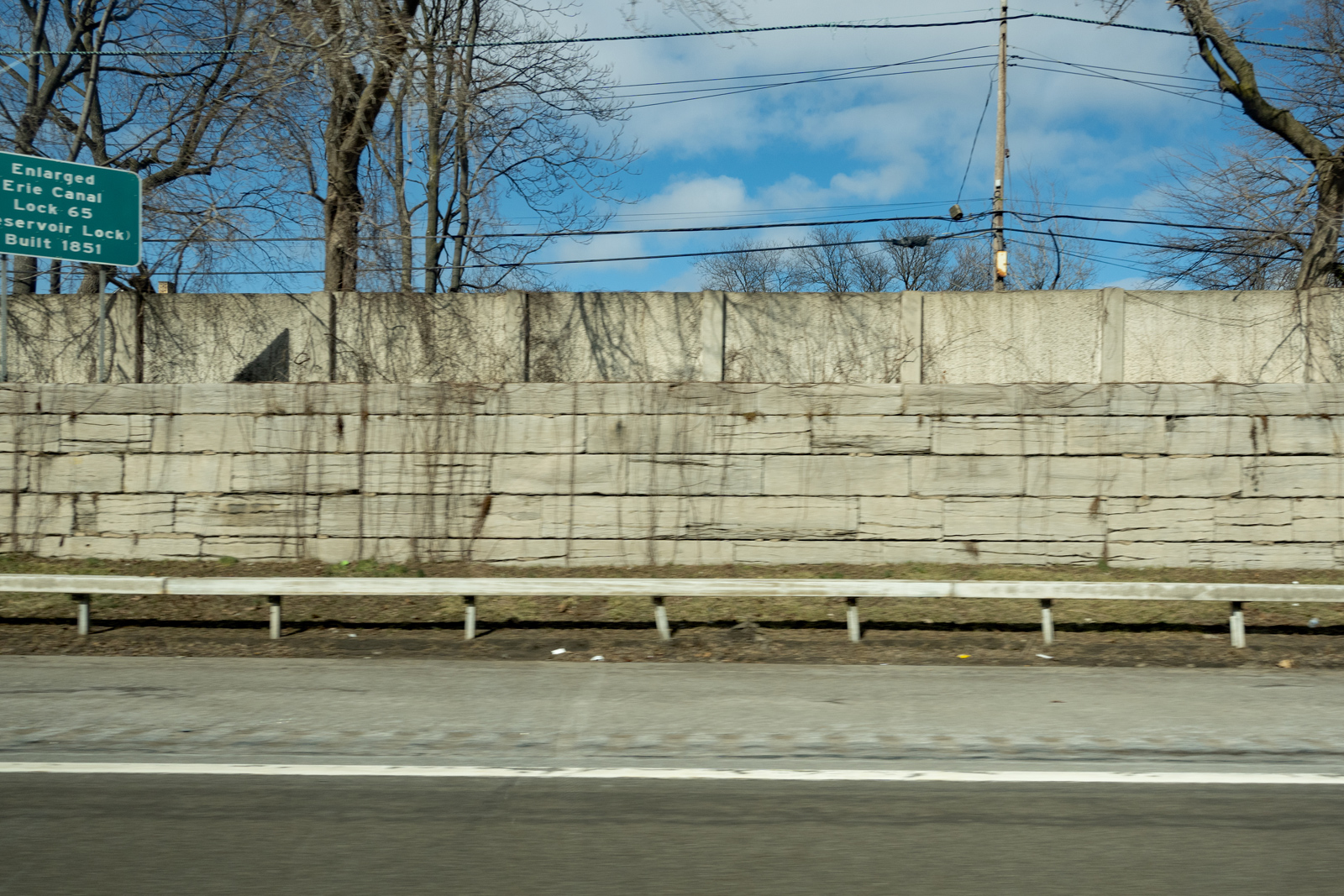 I took this photo through the passenger side window while Peggi was driving to the Co-op. We had to get our monthly shop in. Members save ten percent once a month, the number of times we shop there each month. The wall in front of the wall is what remains of Lock 65 on the Erie Canal as flowed through Rochester. I guess the canal didn’t exactly flow, it just sat there until they drained in the winter months.