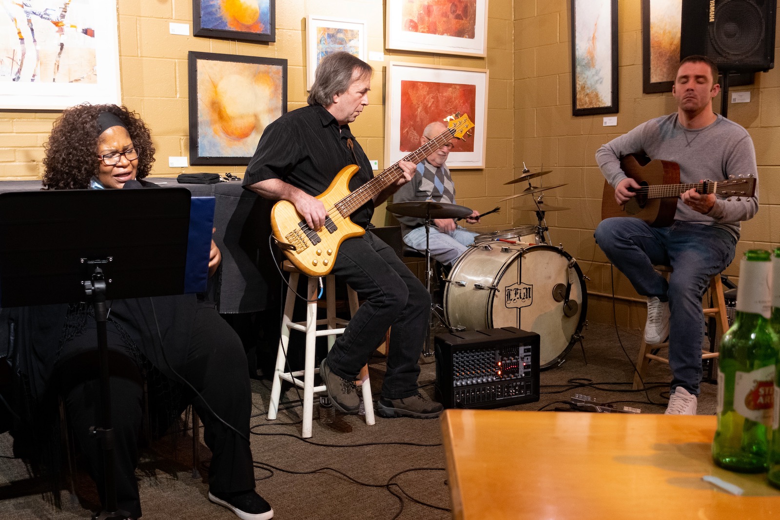 Mike has been a key part of Joe Beard and John Cole’s bands for as long as I can remember. He is a seasoned player. You’ll notice the lead singer, Debbie, is comfortably seated. All the more energy she can devote to heartfelt renditions of classic R&B songs. She can make Kansas City, a song whose form is so fixed it threatens to and most cases does swallow up the song, sound fresh. She is actually able to do it when she sings “I’ll Take You There.” Pete Monacelli, is nestled in the corner on his uncle’s drum kit, a kit that is older than his eighty years. Like pros the band plays a few intro numbers without Debbie and in those sublime minutes you hear every swish of the cymbals, the chick of the hi-hit and the dance of Pete’s brushes.