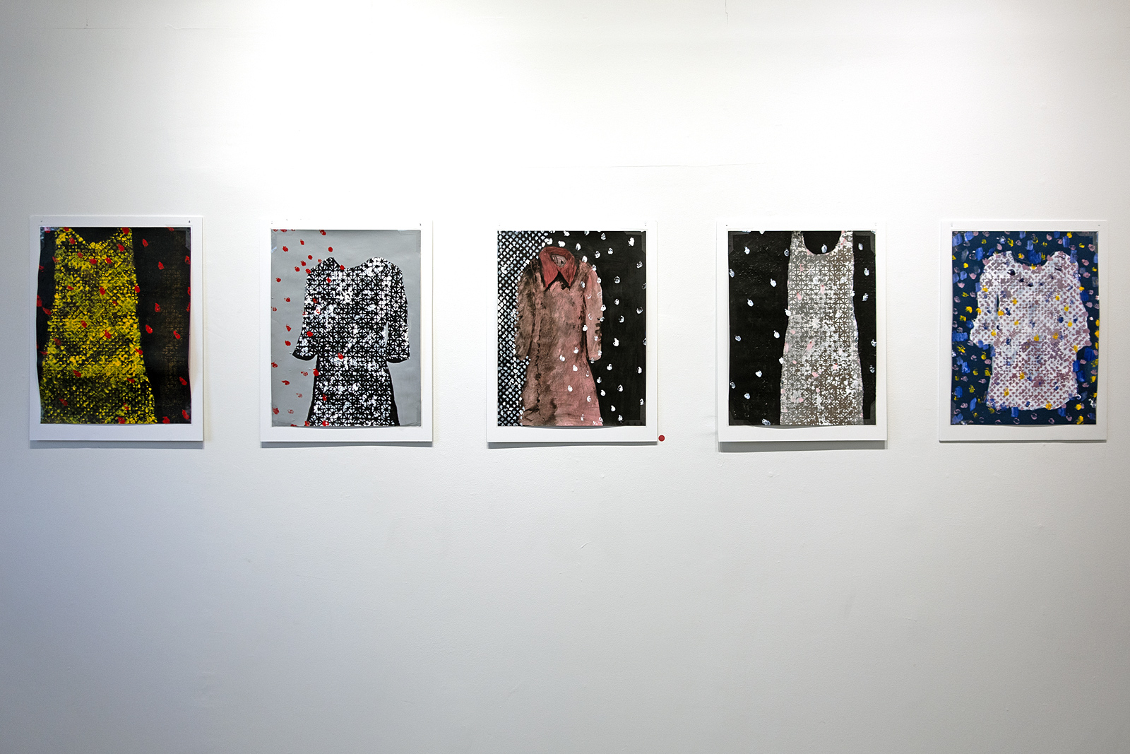 Manifestation is back in boxes. The white walls of Colleen Buzzard’s Studio are singing a different tune this month, “Works on Paper” by Beauty. Although she has been an artist her whole life, this is only Beauty’s second show. I asked her if her clothes really looked like they do in her paintings and she said no. She animates them. In her own words –