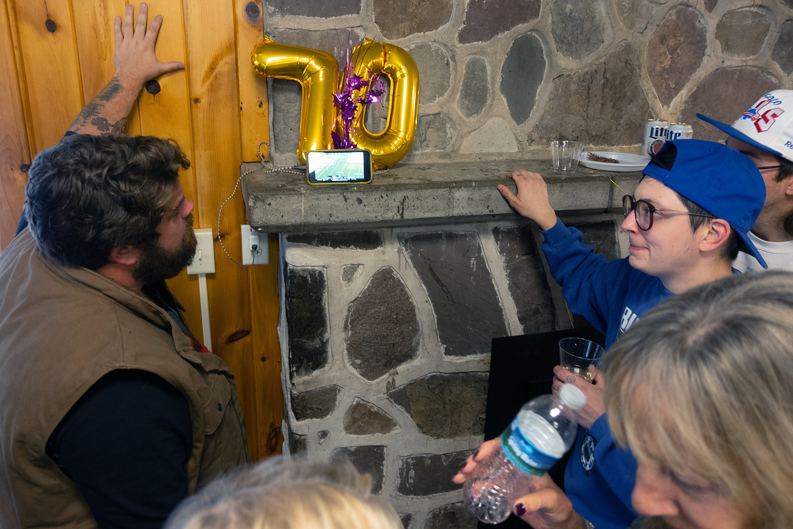 It was pouring rain but I got out and pretended to take a photo. I wasn’t sure how we were going to get Ann out of the car. I waved to the people inside to come on out but I couldn’t tell if anyone even saw me. I asked Ann to get out and we walked to the door just as Leonard, Ann’s work buddy, came out. He held the door open and everyone screamed. There were about a hundred people inside. I thought my sister was going to have a heart attack but she was just overjoyed. She watched bits and pieces of the game on this tiny screen. The Bills lost by two points but my sister had a ball.