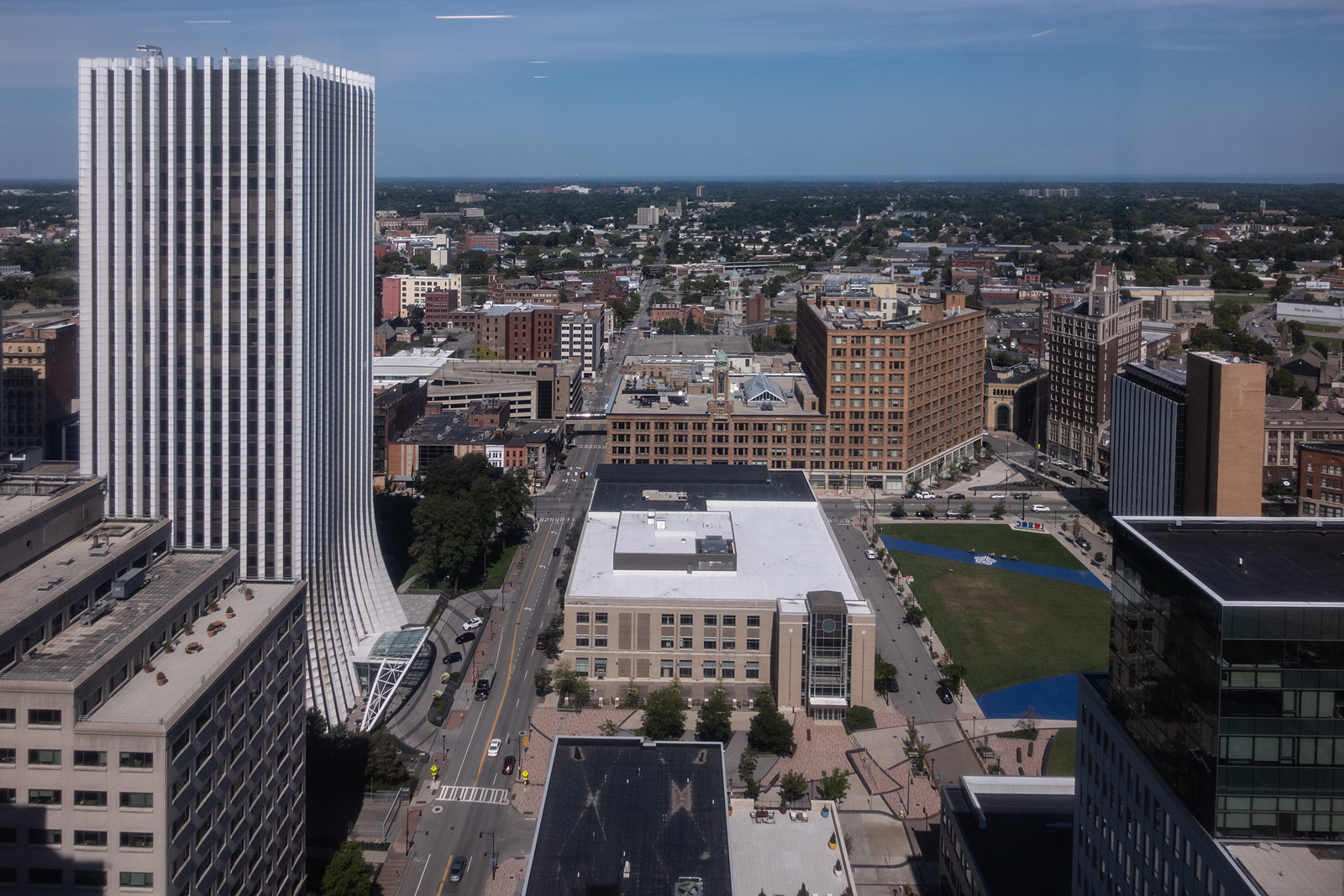 I think that is the lake out there and our house somewhere on the horizon at the upper right. Tim Schapp used to have a view like this when he worked in the Lincoln First Bank, the white building on the left of this photo. Innovation Square, the former Xerox corporate headquarters, was our first stop on Saturday’s Rochester Landmark Society tour. This is the view from the shared office space on the 24th floor. We visited the gaming center on a lower floor and then an apartment before moving on to four other buildings. The repurposed, former industrial spaces were the most interesting. The newly constructed apartments are nice but a little too orderly.
