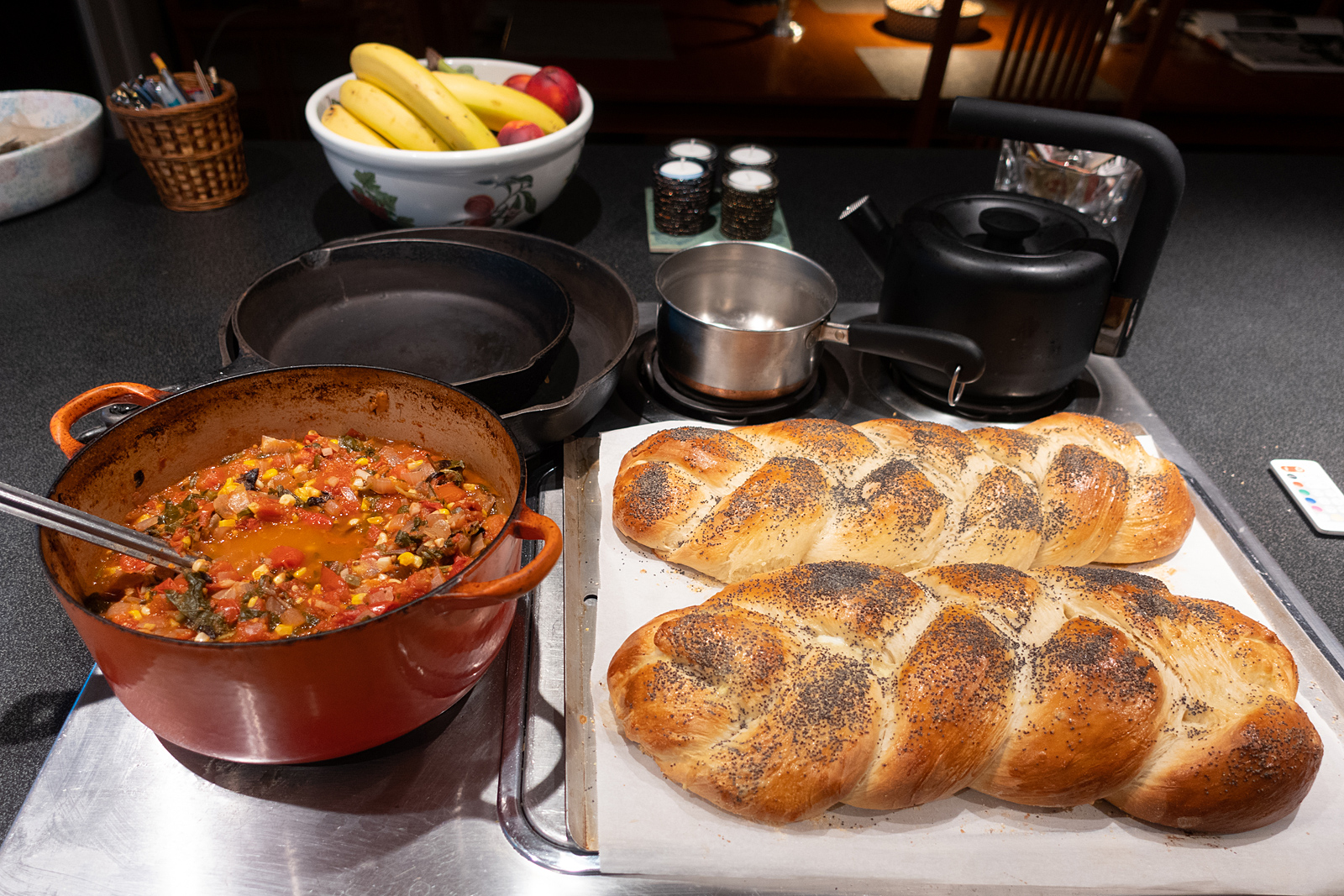 Another Jewish holiday has passed and Peggi has made three more pots of sauce (this orange Le Creuset pot, a glass bread pan and a Corning dish) but no challah. She has been making bread with Gloria’s sour dough starter and the sweet challah loaves doesn’t work with that. We plan to check in the garden today but those were the last batches of sauce. Our tomato output has slowed to a crawl and the basil is spent.