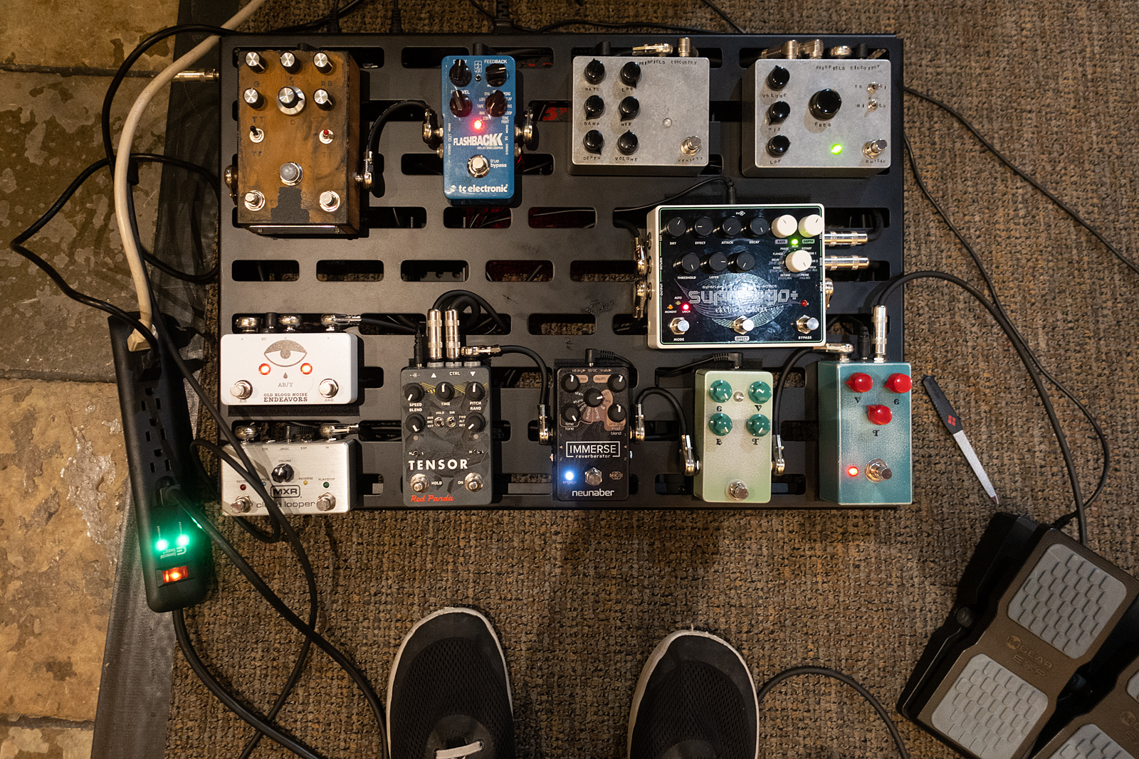 Phil Marshall’s effects pedal board is forever in flux. I took photo of it last night before we started. We were there early for a change and started on time. Some nights we come away with ten songs but were were able to get thirteen on Wednesday.
