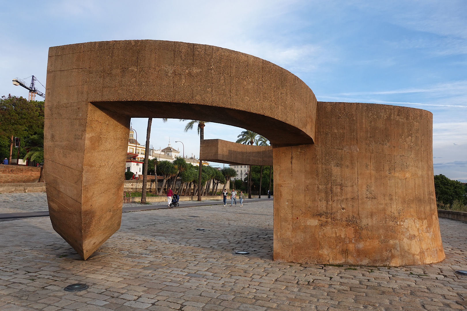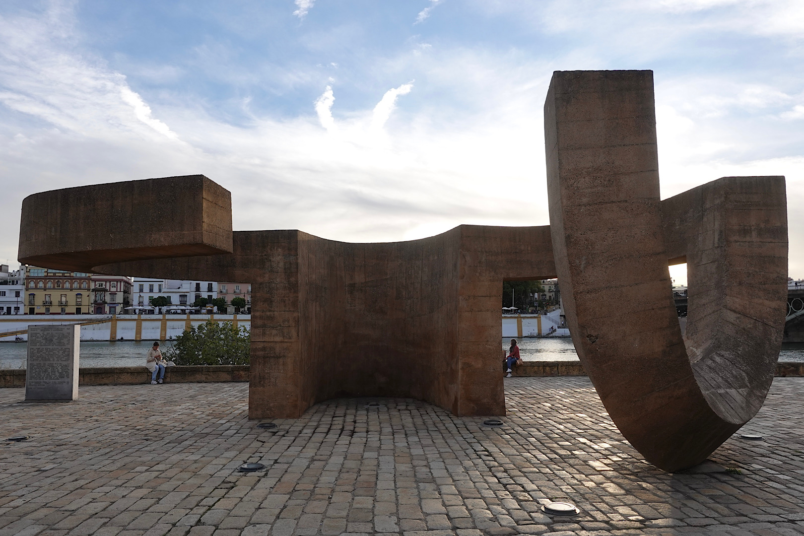 We took a high speed train to Sevilla this afternoon where it is almost twenty degrees warmer. We walked across the Rio Guadalquivir river and along the bank on the other side, a neighborhood called Triana. We crossed back over on another bridge and came across this piece called “La Tolerancia.” I photographed it from all sides and couldn’t decide which to post. We bought a loaf of fresh bread, some cheese and a bottle of wine and returned to our room in the old section of this beautiful city.