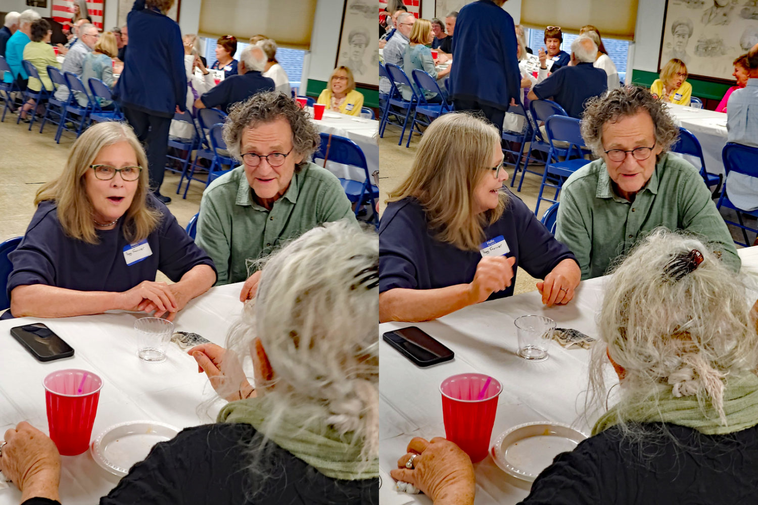 I go on Facebook to post Margaret Explosion gigs and this time I found some photos from last weekend’s reunion of RL Thomas high school. I snatched these two of Peggi and Jeff Munson. They’re shown talking to Nina Gaby (in the foreground.) I was sitting to Nina’s right and am thankfully out of the frame.