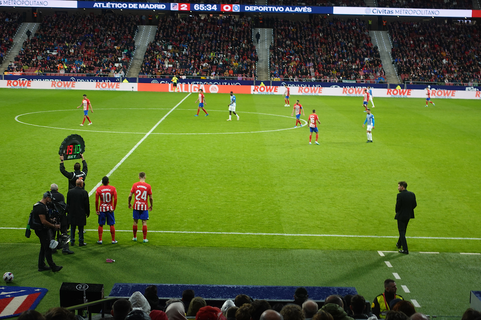 Our seats were better than we imagined, just over the tunnel, between the two benches. My watch alerted me to dangerous sound levels before the match had even started. Our first impression was how much faster the game seemed in person and rough. We could hear the up close collisions. It was indeed a fast paced opening, a wide open match with lots of turnovers. I got a great shot of El Cholo well outside his box, both feet on the playing field, animated as ever in all black. But I’m posting this one of one our favorite players, Angel Corea, getting subbed in for Morata in the 64th minute.