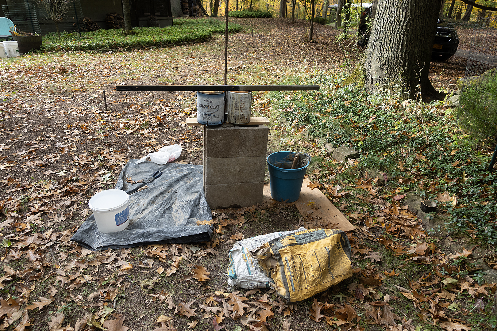 When we were doing some construction on our house Bill stopped by and picked up a piece of re-bar with concrete attached to it and he stuck in the ground out back. We left it there but the winters took a toll. The concrete crumbled and the re-bar was all that remained. This weekend Peggi and I rebuilt the sculpture using leftover concrete from a pool project mixed with the mortar we skim-coated our concrete block house with before painting it this summer. We used three concrete blocks as the forms and lined it with an old sheet of rubylith (Peggi’s idea). I cracked the blocks open in the morning and the sculpture emerged. We stuck it back in the ground where Bill originally put it.
