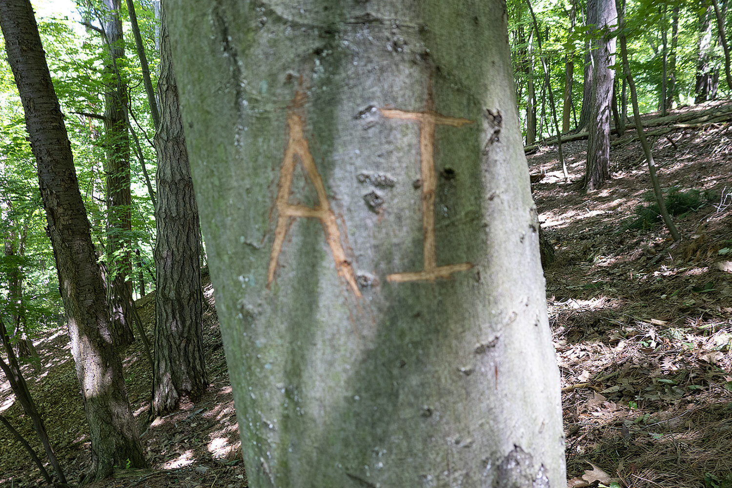 We were walking up a hill on a path in the park today. We got to the top and I looked up and saw these two letters carved into a tree.