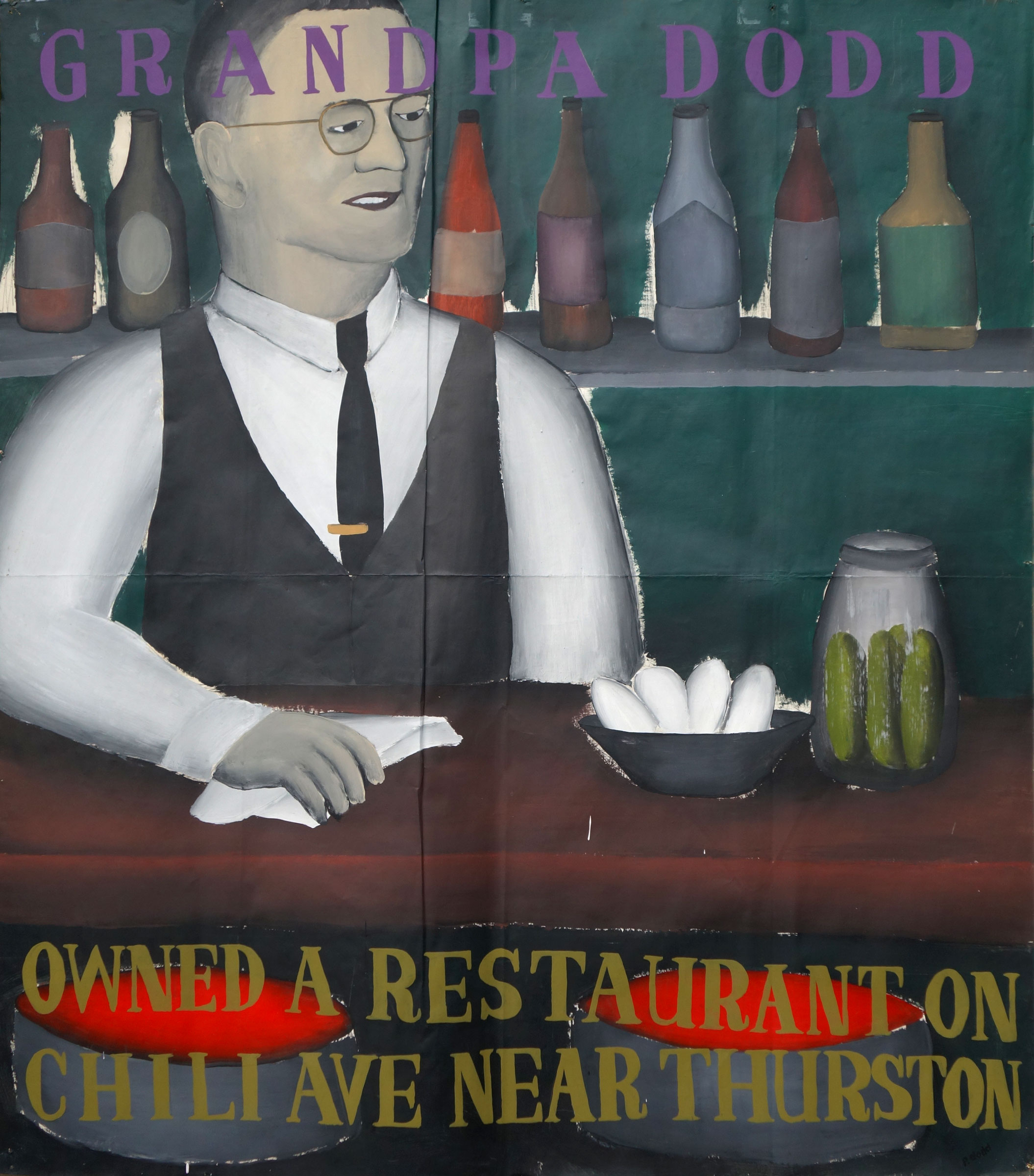 If one were to look for the heart of this expansive exhibit of work, it might well be found in the ten large acrylic paintings by Paul Dodd, one of the three artists whose work physically dominate the gallery space. Mr. Dodd comes from a family with roots in Rochester reaching back at least three generations on both sides. Biographical information and diagrams of his family tree accompany the works, affectionate, whimsical portraits of each grandfather, and several of his aunts and uncles. Of one set of grandparents he writes, ‘they had a house built on Burlington Avenue and lived there the rest of their lives.’