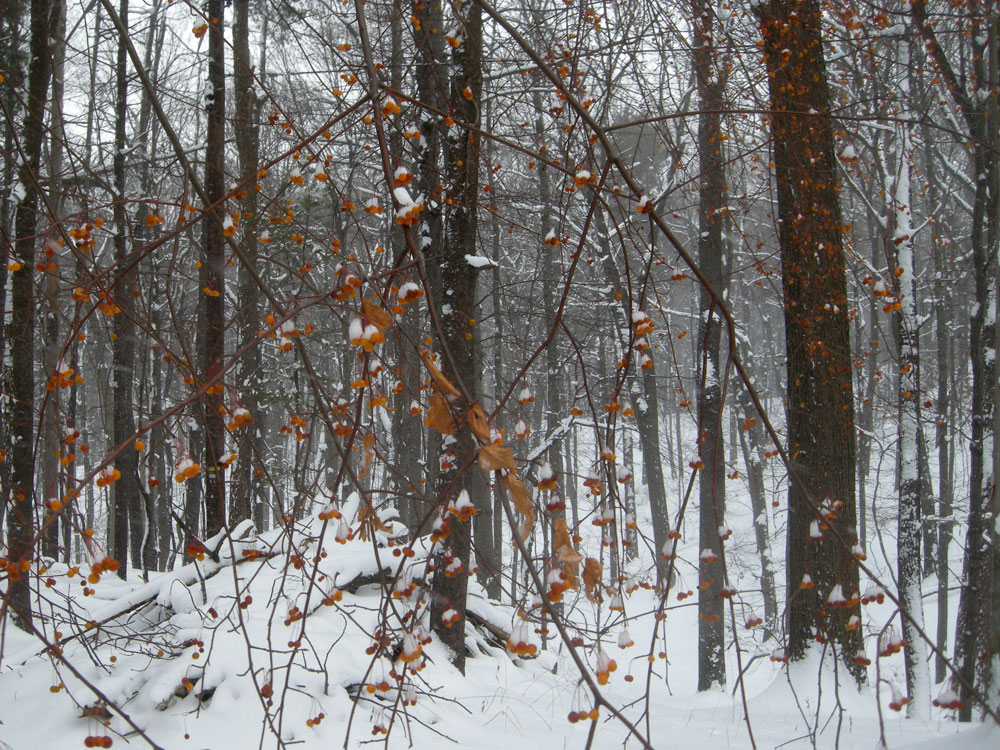 I don’t remember this yellow cherry tree from last year. It’s the first thing we saw today as we entered the woods. The skiing was excellent as long as we didn’t stand still. The ground is not quite frozen yet so the snow is sticky down there.