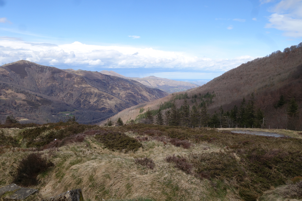 We usually exit along the big ridge trail that leads over to Spring Valley but before we get out on the road we have to cross the creek and it is often running pretty full in the Spring. We found a crutch-like stick and rearranged a few big stones in the water in order to cross.