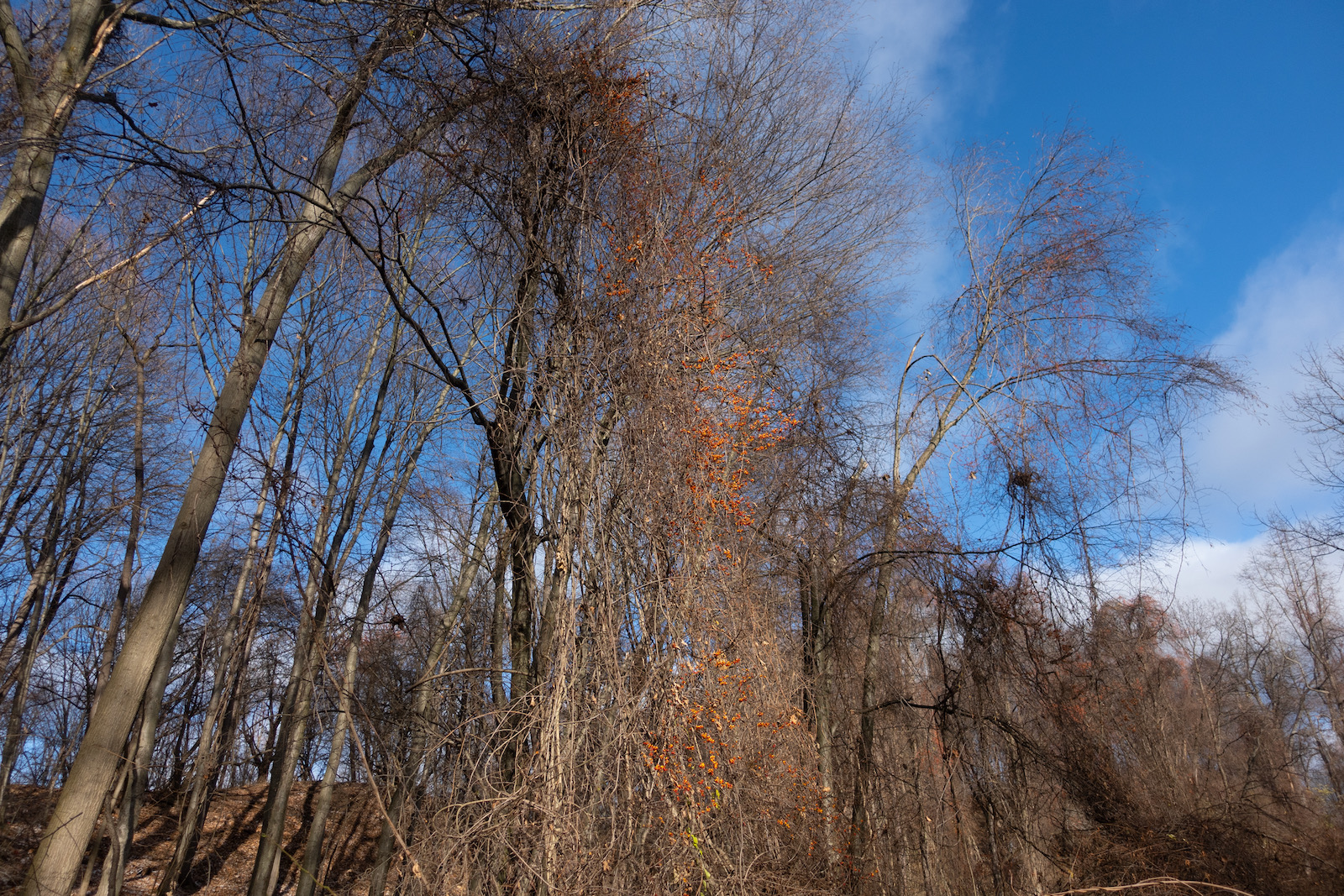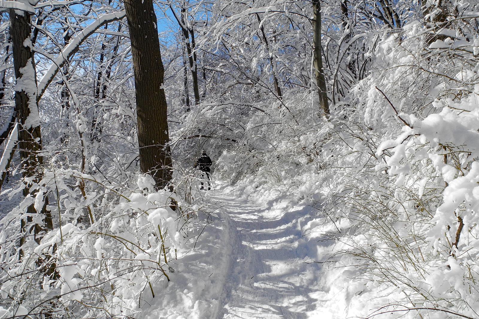 The fallen trees in hills here look like art installations and there is never anyone up here. You do have to forde a creek that runs along Spring Valley and the first hill is a serious climb, something that is impossible with snow on the ground. The paths are completely overground with invasive plants in the summer. You would need a machete to get through the black swallow wort and mustard green. Those tick harboring plants have all died back now so our visit was sensational.