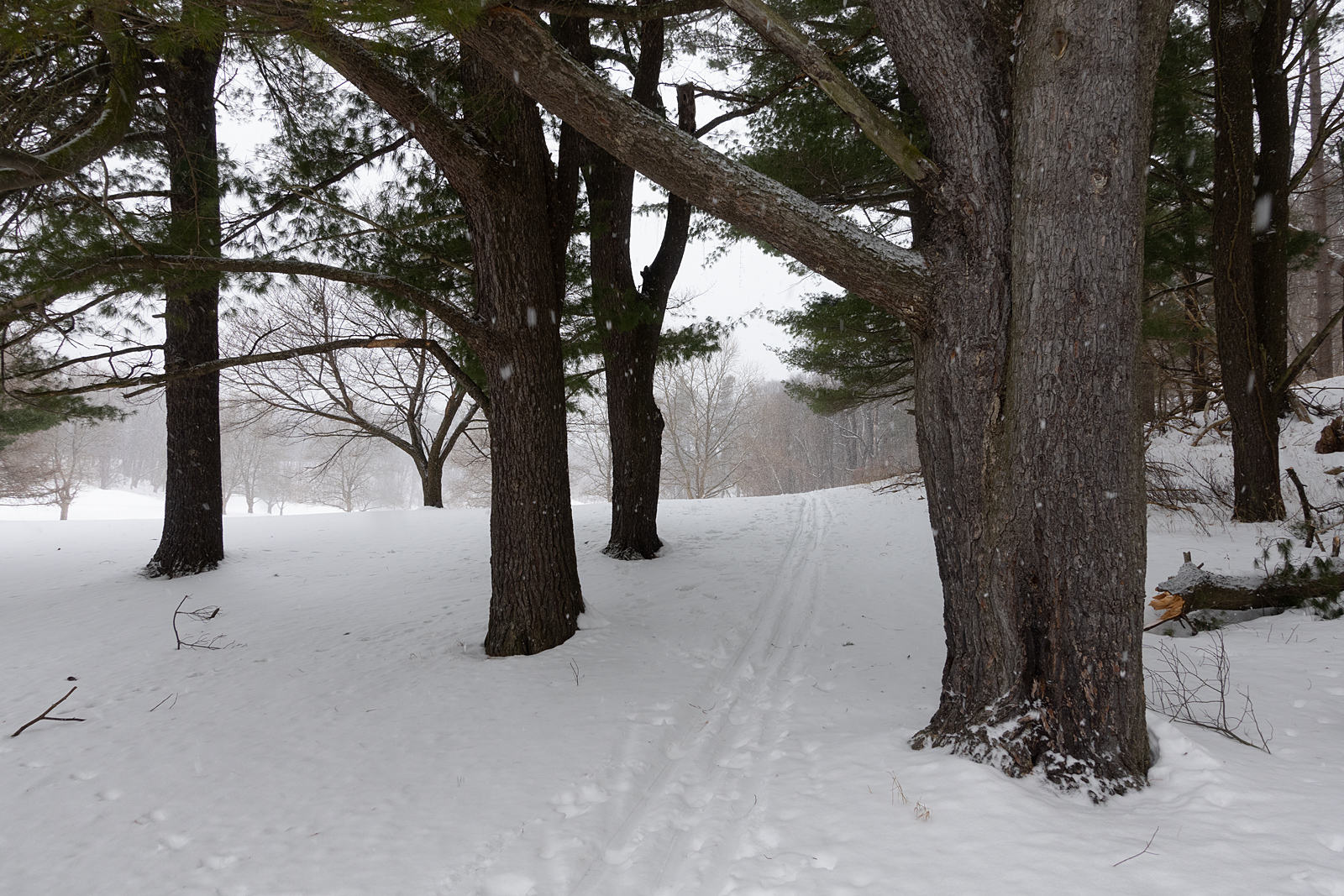 Today is a perfect winter day. Temperatures in the low twenties, a hint of sunshine, a gentle big-flake snowfall which after a few hours left enough fresh powder on top of the iced over ground cover to permit skiing. For only the second time this winter. We skied up to lake and turned around. We’ll make a fire and watch the Madrid Derby, a La Liga match between Real Madrid and Atletico Madrid. They are two of our favorite teams but when they meet we’re all in for Atletico. Our red led lights will be on for the evening.