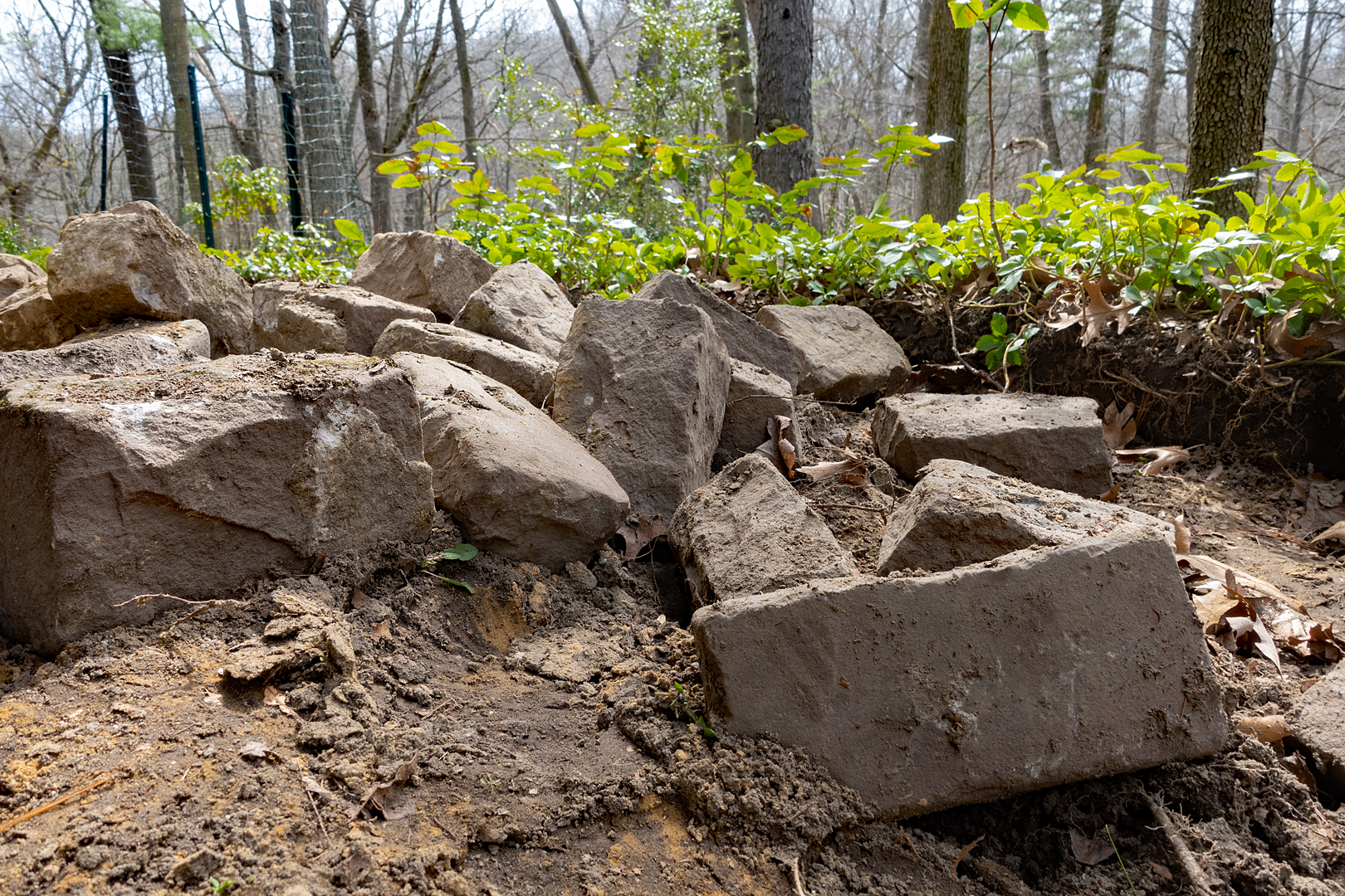 It seems most of the neighbors in this area have these pavers in their yards either as garden edging, walkways or stone walls. I’m guessing Culver Road was once paved with these all the way to the lake and at some point they dug them all up, paved the road and gave the pavers away. Funny how that generation of homeowners is gone and the stones are still here. We’re having a landscape company put some blue stone down in its place And Peggi and I have been building a short fence with the stones.