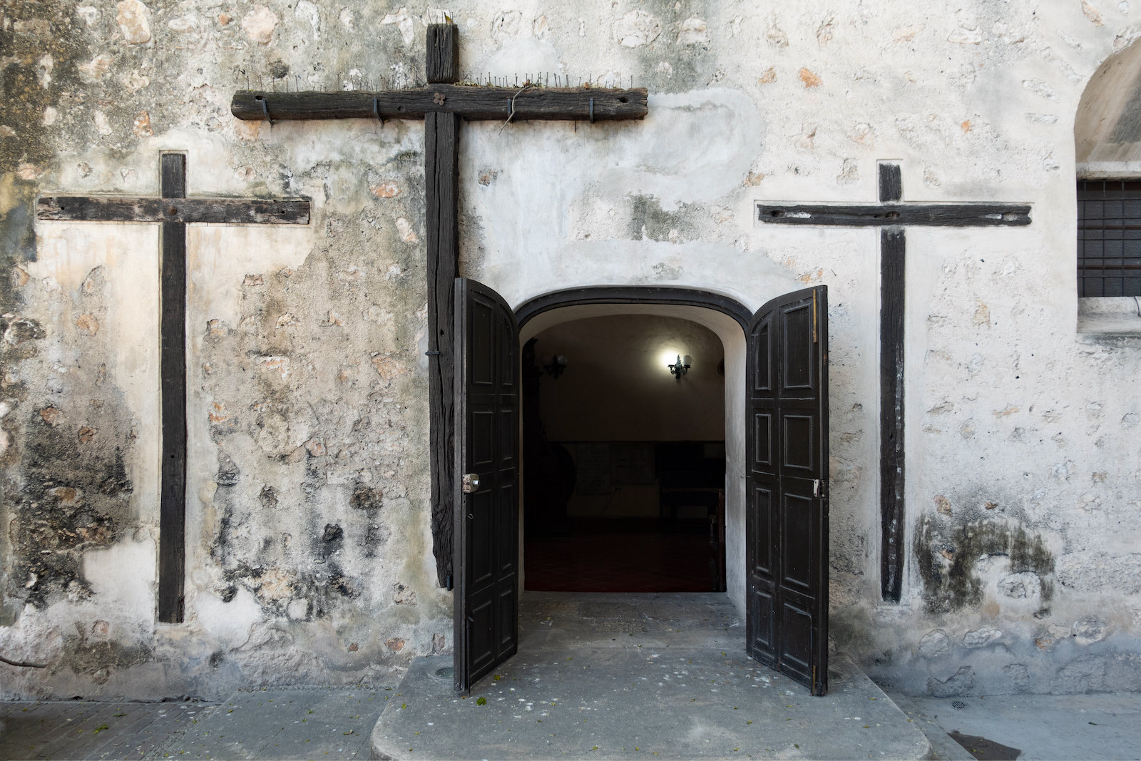 At the foot of each saint is one sixth of a quote from Timothy, “I have fought the good fight. I have finished the course. I have kept the faith.” Interestingly, each panel also includes insignias of the US allies in the great war, a wacky combination of religion, warfare and politics.