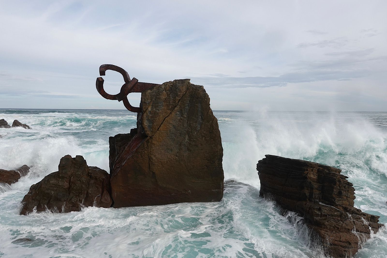 At the Chillida Museum we learned the number 3 had a special significance for the artist. Today we found that the third time is indeed a charm. We walked to the edge of town for the third time and finally found it safe to enter the plaza where Peines de Viento is installed. The wind had prevented us from entry for two days. We took at ton of photos like everybody else except we didn’t do any selfies. The three Chillida pieces installed here are a flat out masterpiece. This is how Chillida described it.