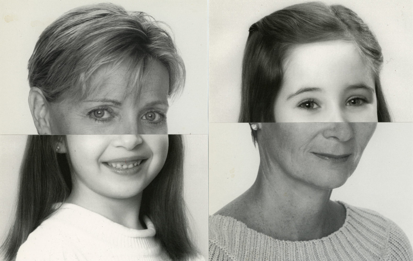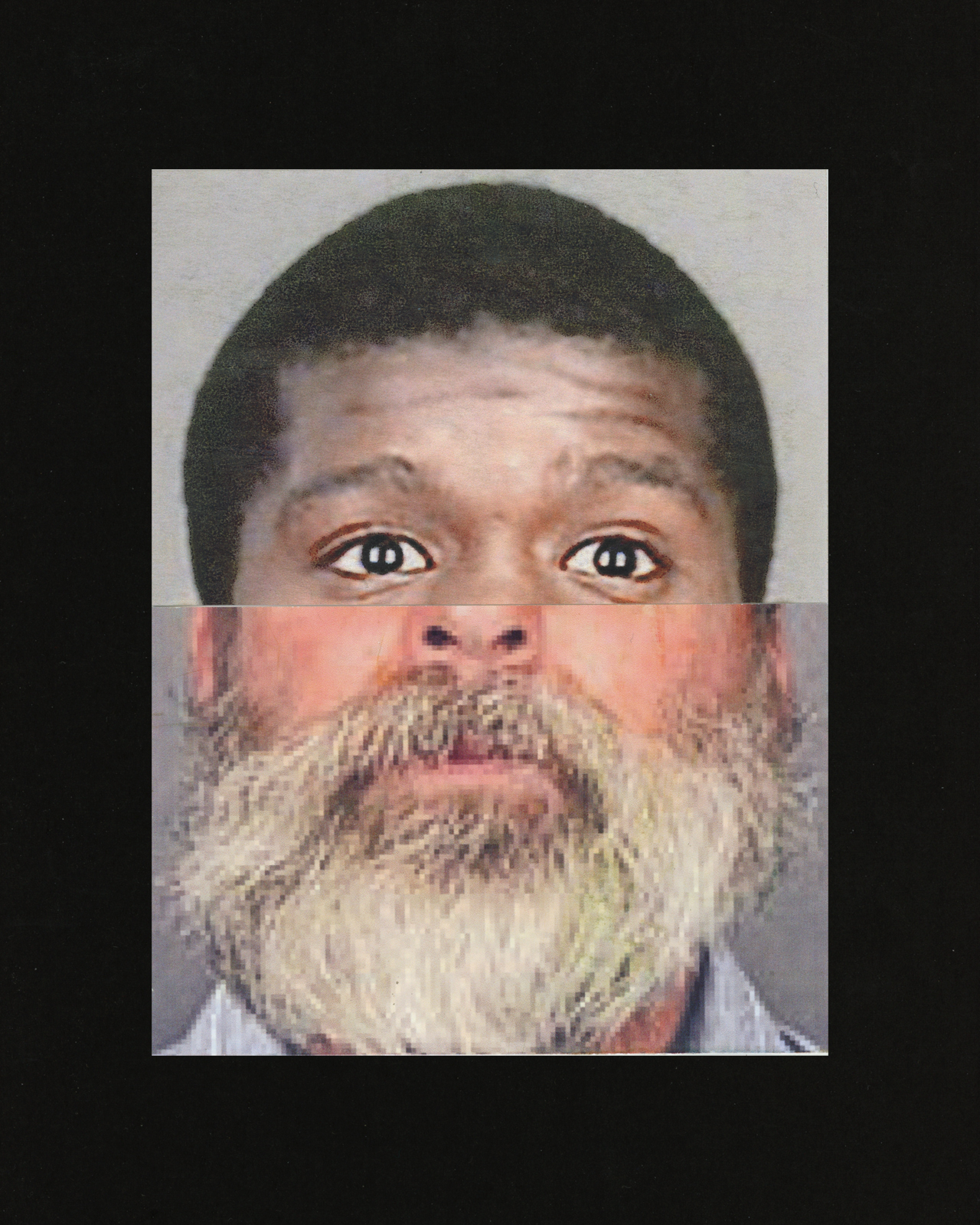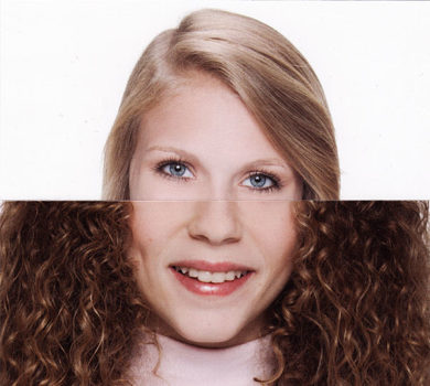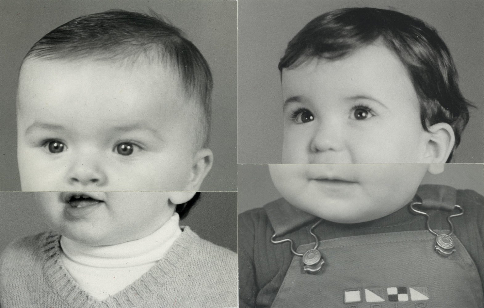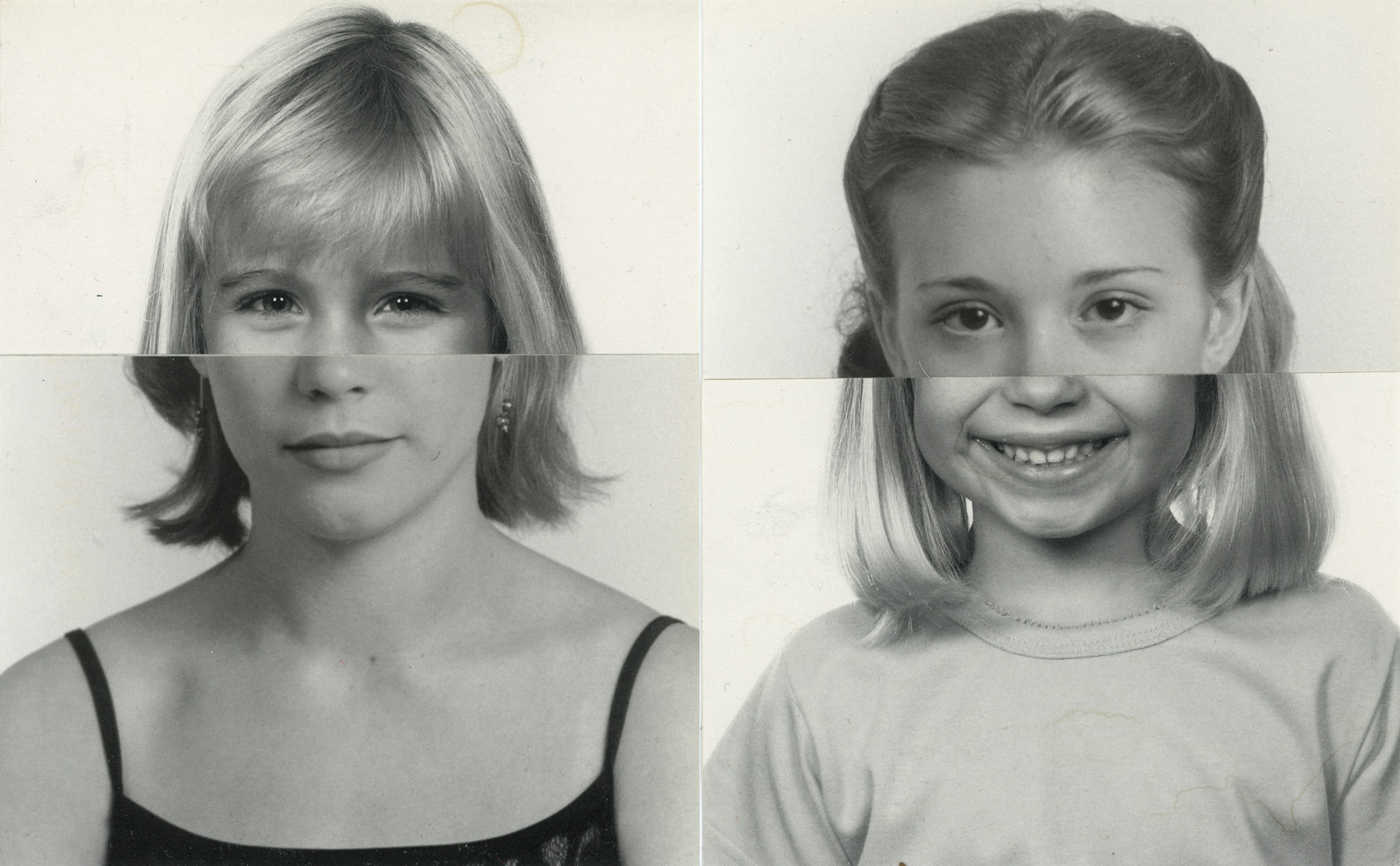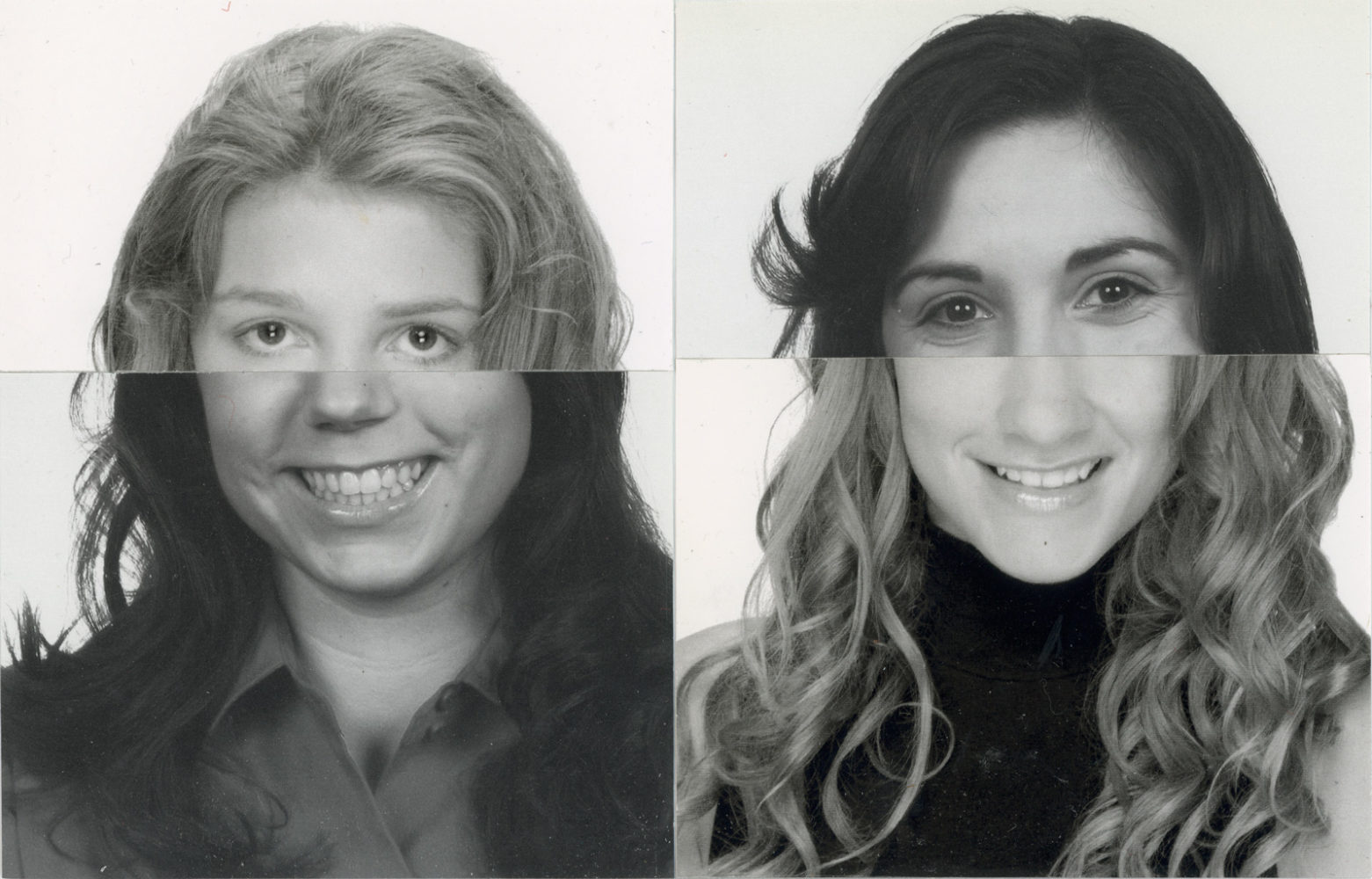 These headshots were B&W prints, 8 1/2 x 11s, sent to us by an agency in hopes we would hire their models. There’s two poses on each print, a head shot and a full body pose. I picked two headshots, sliced them, swapped one with the other and pasted them in a three hole punched notebook. I got pretty good with an X-Acto knife back back in the cut and paste days of graphic arts.