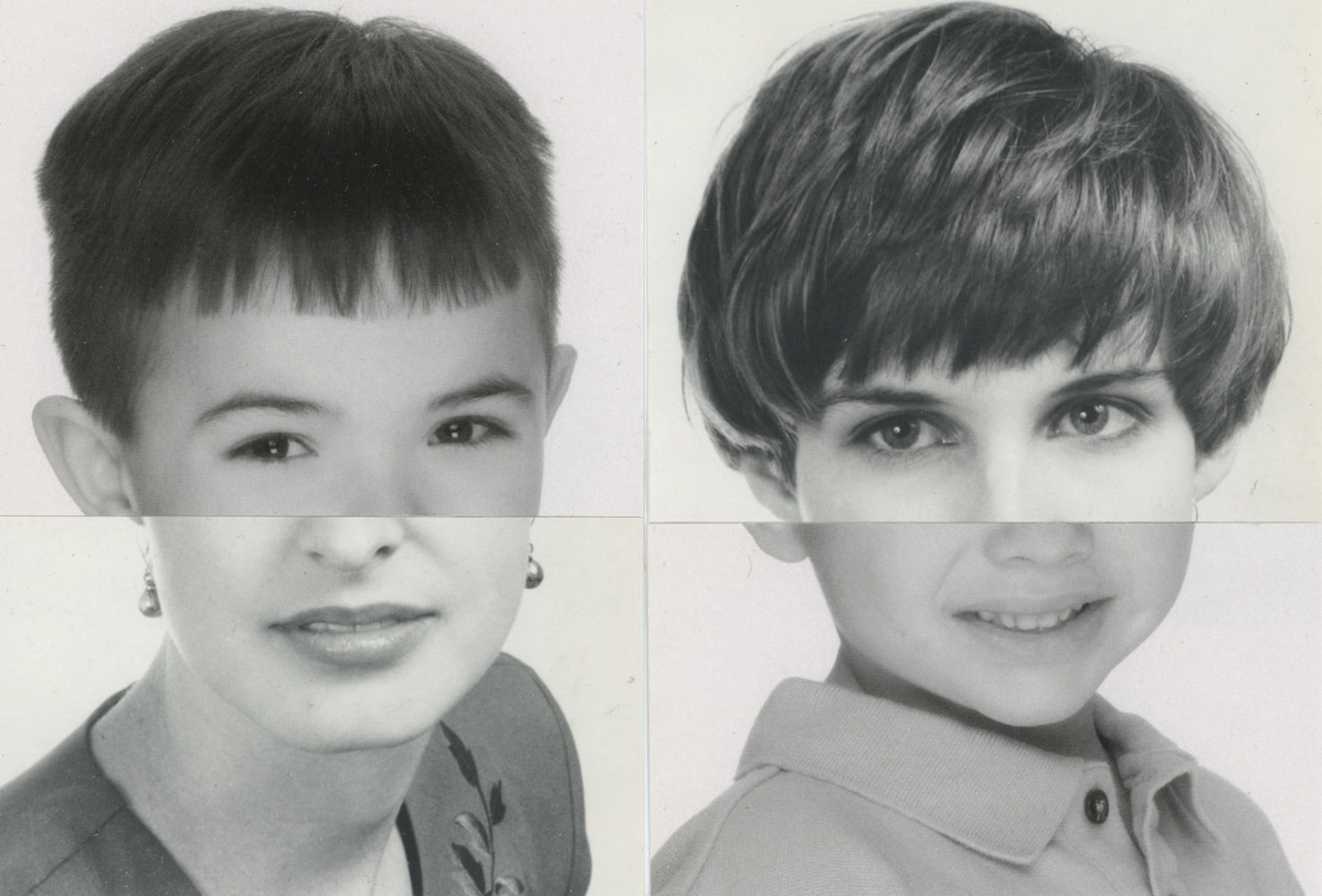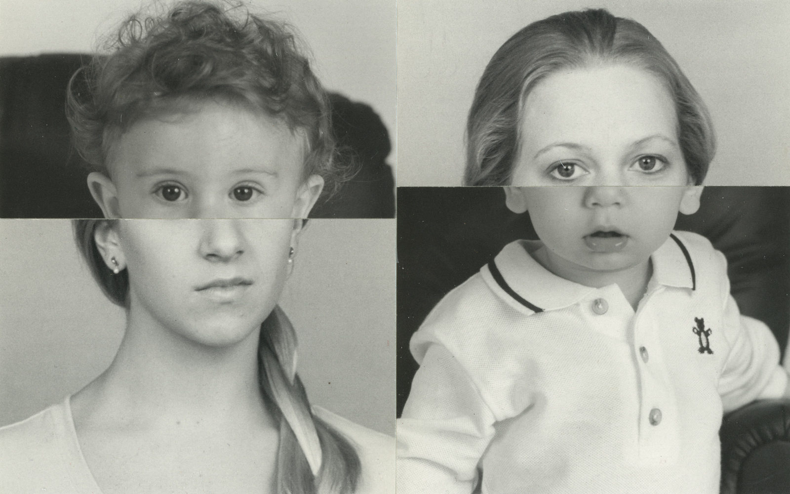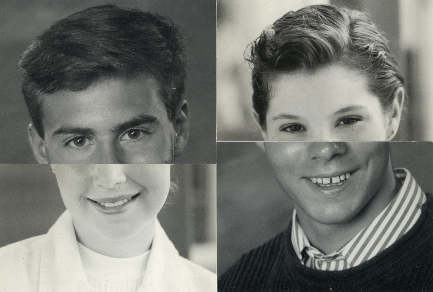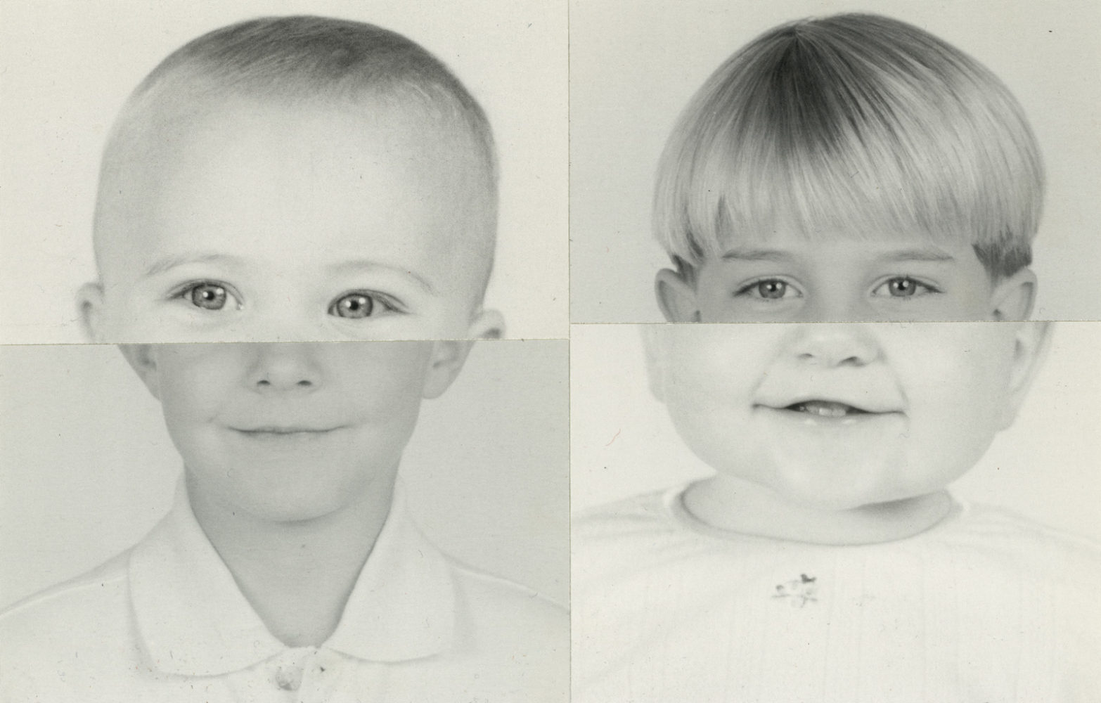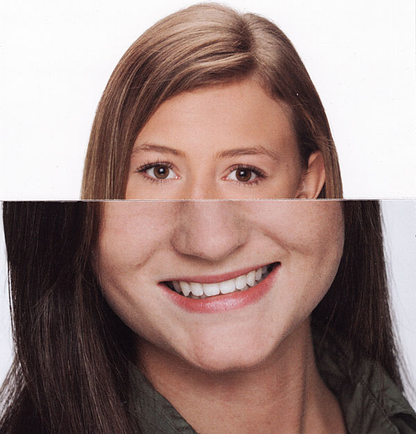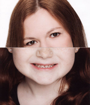 These headshots were B&W prints, 8 1/2 x 11s, sent to us by an agency in hopes we would hire their models. There’s two poses on each print, a head shot and a full body pose. I picked two headshots, sliced them, swapped one with the other and pasted them in a three hole punched notebook. I got pretty good with an X-Acto knife back back in the cut and paste days of graphic arts.