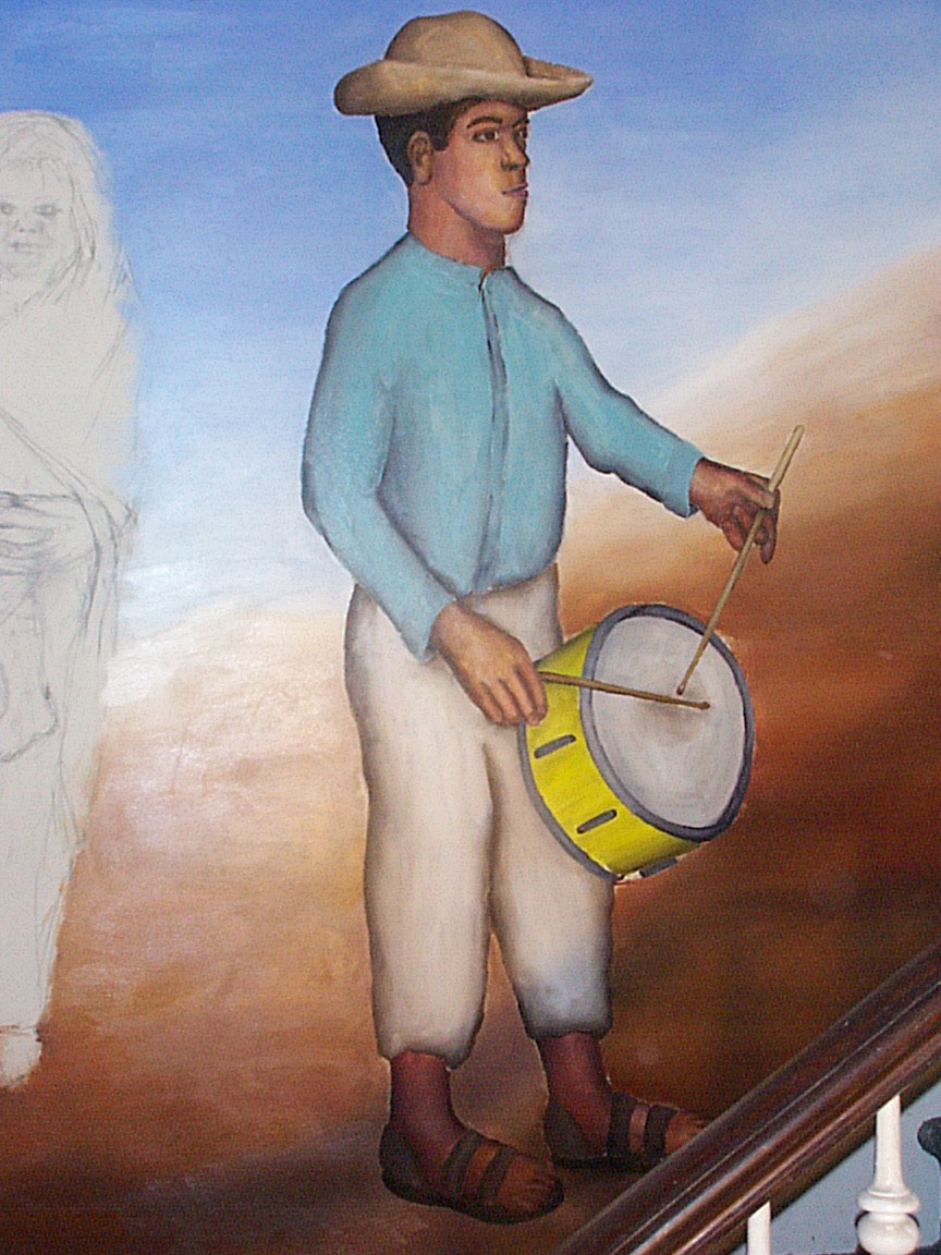 The dry run went vey smoothly. The food was tremendous. So they open the doors on Wednesday. I had to finish the mural this weekend and I did. Peggi helped me finish the background and clear up the little white spots of bare wall left between the colors. I changed the color of the snare drum downstairs.